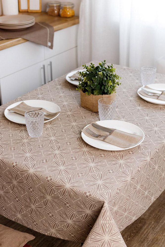 Скатертина з колекції "Кориця". Скатертина в бежево-коричневій гамі з гарним візерунком, чудово доповнить сервірування столу, стане стильним акцентом в інтер'єрі. Якісна тканина з натуральної бавовни прослужить вам довгий час, зберігши первісний колір і вигляд.