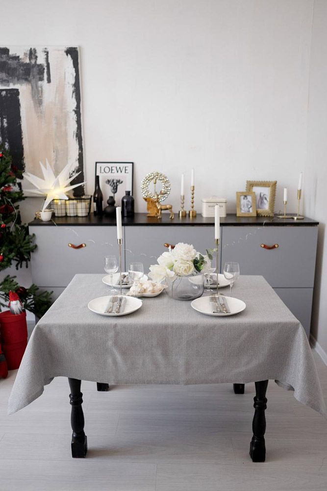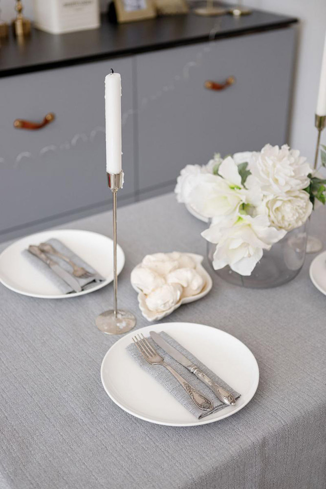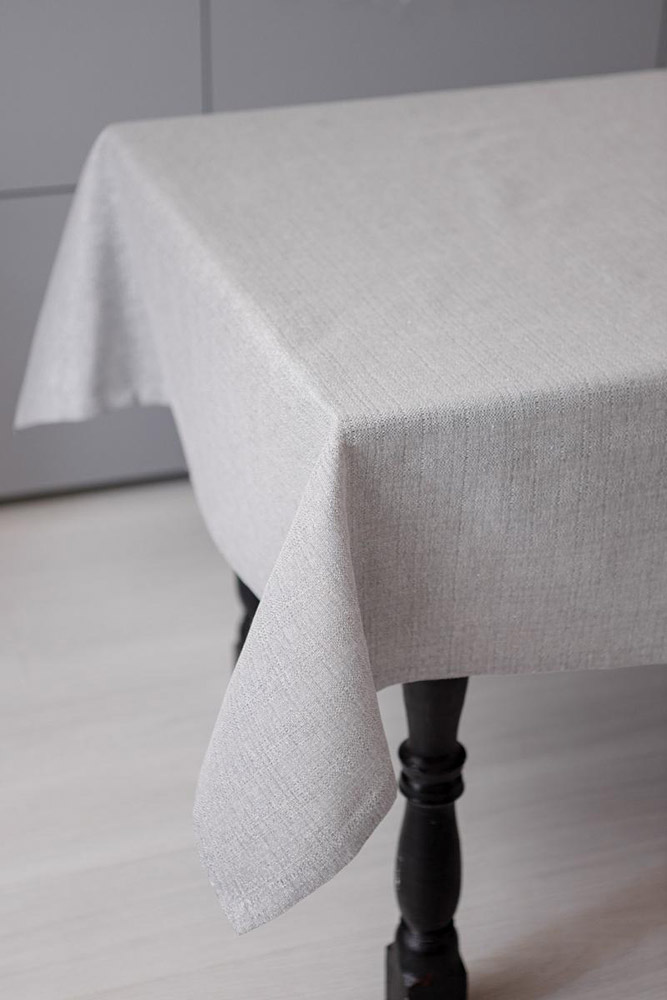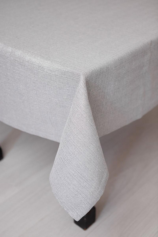 Однотонна скатертина сріблясто-сірого кольору з мерехтливими нитками люрексу. Скатертина стане святковим акцентом на столі, чудово доповнить сервірування, створить відчуття затишку і гармонії в інтер'єрі. Скатертину виконано з міцного і якісного іспанського матеріалу на основі бавовни і поліестеру.