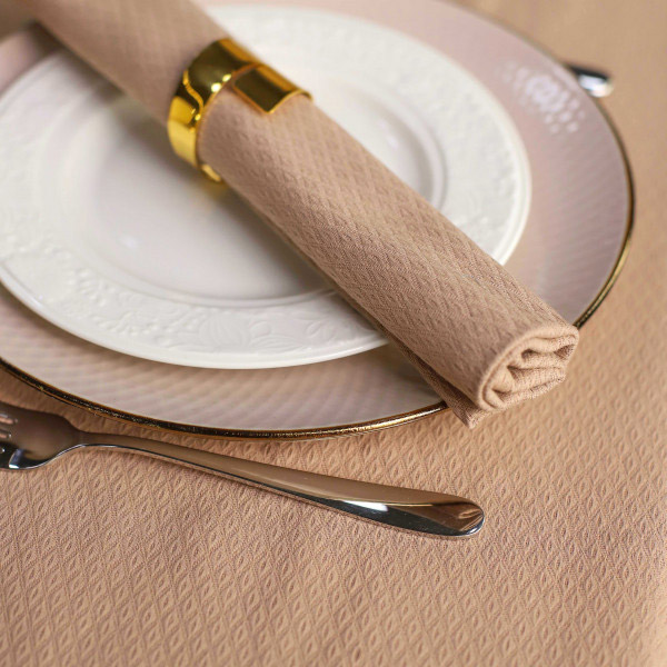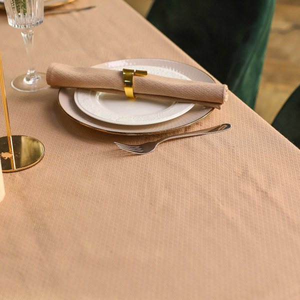 Однотонна скатертина з міцної тканини коричневого кольору з рельєфною текстурою. Скатертина відмінно підходить як для повсякденного використання, так і для сервірування святкового столу. Матеріал щільний, приємний на дотик, практичний і міцний, прослужить довгий час без втрати якості.