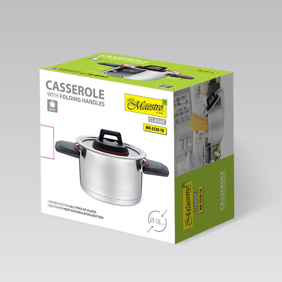 Каструля об'ємом 2.3л, діаметром 18 см, вирізняється сучасним ергономічним дизайном. Каструля виготовлена з високоякісної нержавіючої сталі. Ручки виконані з бакеліту, можуть складатися для зручнішого зберігання. Кришка виконана з жароміцного скла зі зручною складною ручкою, оснащена отвором для виходу пари. Каструля з багатошаровим термоакумулюючим дном. Можливе використання на всіх типах плит. Каструлю можна мити в посудомийній машині, що значно спрощує догляд за виробом.