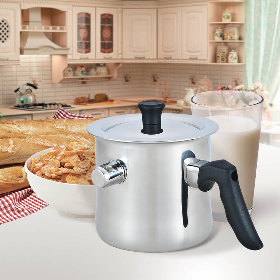 Молочник 1,5л Maestro MR1698. Молочник з подвійною стінкою та свистком, що повідомляє про закипання води всередині стінок. Молоковарка виготовлена з високоякісної нержавіючої сталі з бакелітовою ручкою, що не нагрівається. Пристрій: в корпус між стінами заливається вода, джерело тепла (плита газова або електро) нагріває зовнішню стіну, зовнішня стіна нагріває воду всередині корпусу, вода нагріває внутрішню стінку, внутрішня стінка нагріває молоко. Дана конструкція дозволяє уникнути перегріву молока (молоко не може втекти). Максимальна температура внутрішньої стінки становить 99°С.