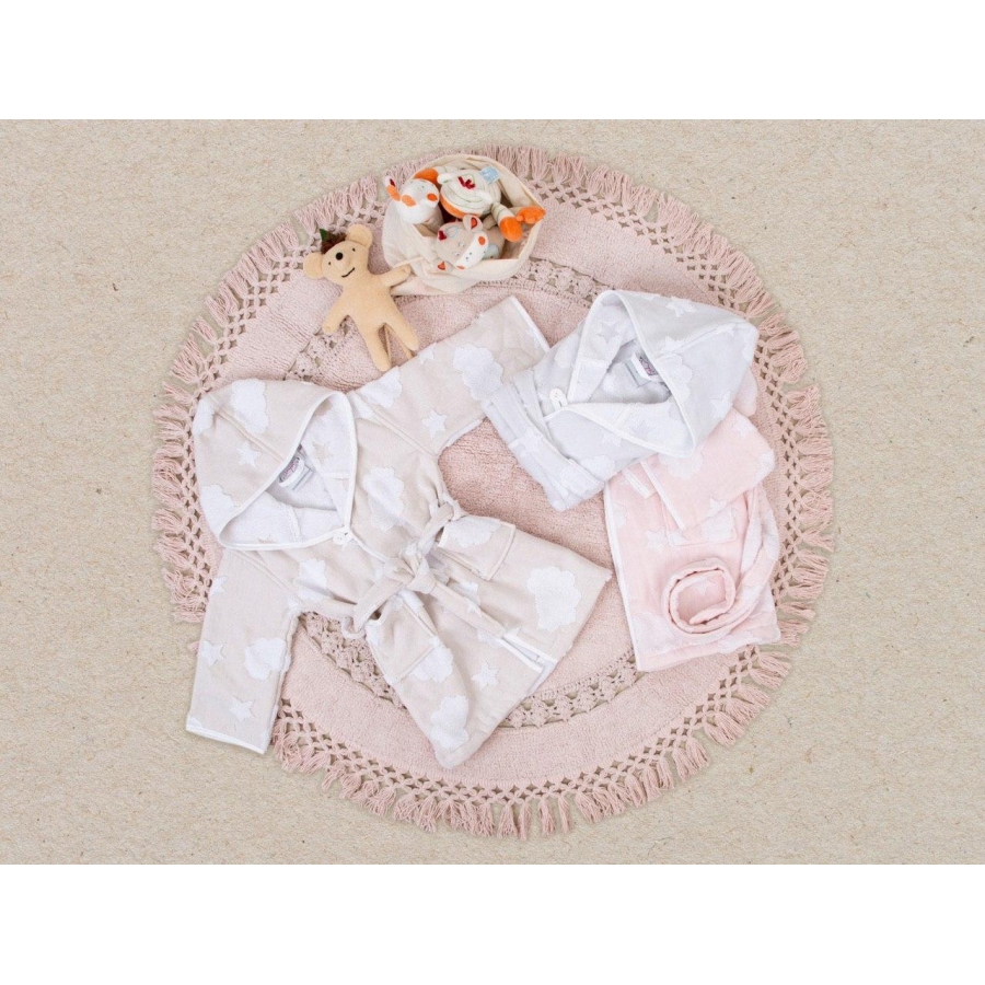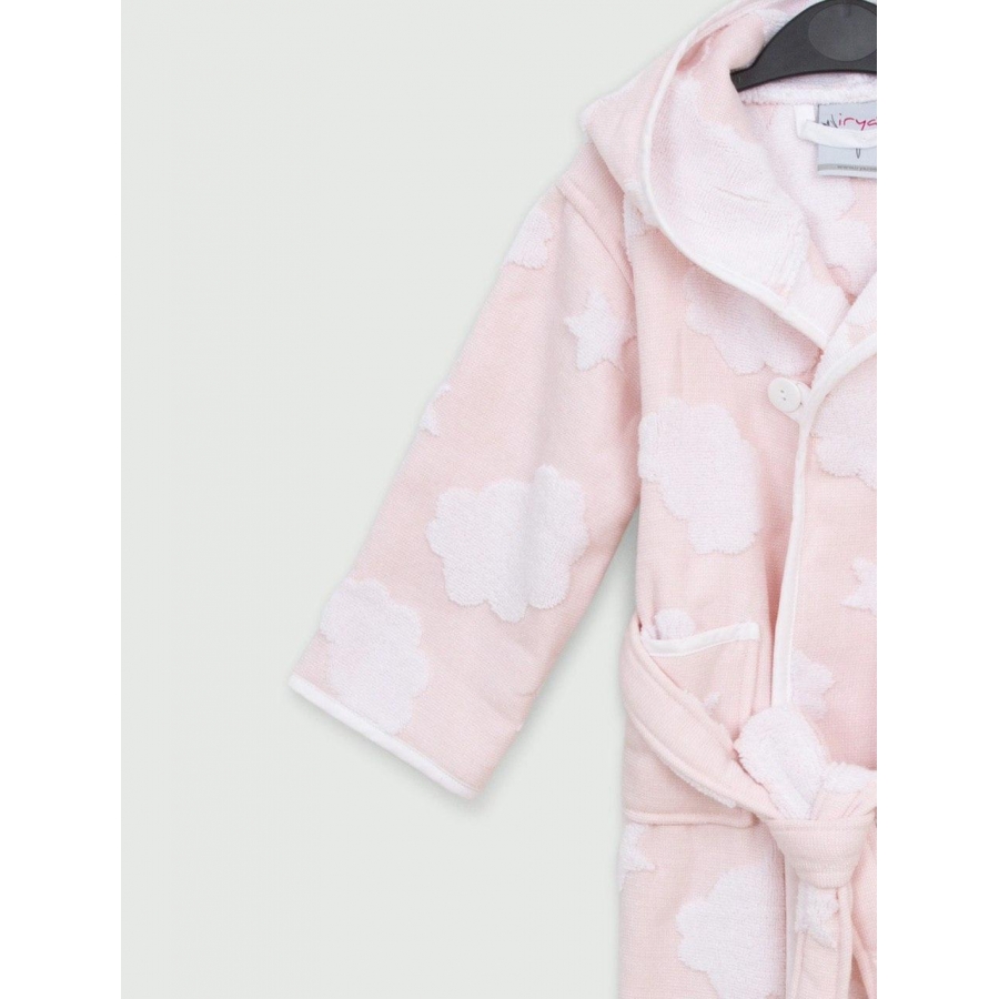 Махровий дитячий халат пудрового кольору з ніжного матеріалу з рельєфними зірочками та хмарами. Халат має м'який комір, зручний пояс та кишені, а також застібається на гудзики. Халат м'який і приємний на дотик, виконаний з натуральної бавовняної махри.