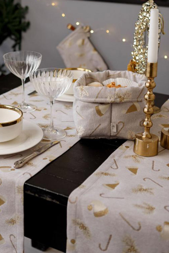 Тканинний декоративний кошик-хлібниця являє собою зручне і стильне рішення для подачі хліба. Хлібниця легка, функціональна, займає мало місця. Модель у бежево-золотавій гамі з симпатичним святковим малюнком, чудово впишеться в інтер'єр кухні, доповнить сервірування столу.