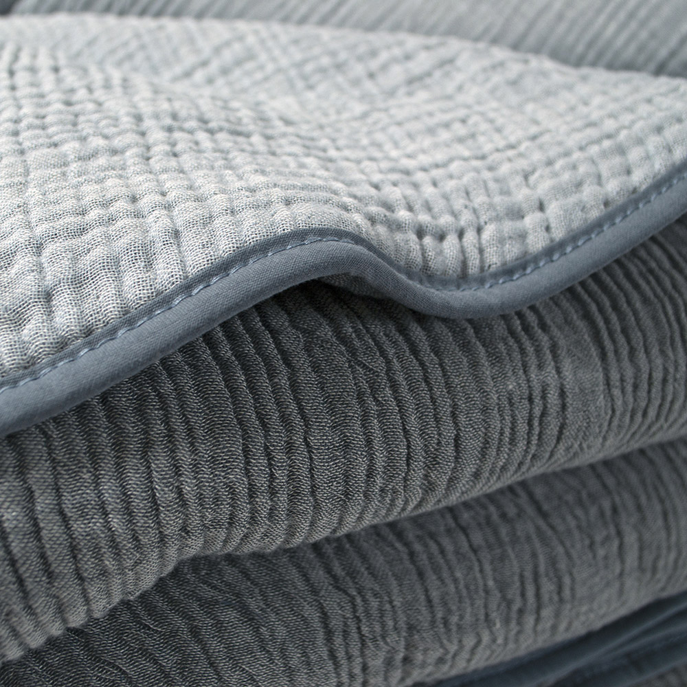 Стильне двостороннє покривало з мусліну. Одна сторона виробу - сіро-блакитного кольору, а інша - блакитного кольору. Покривало стане гарним акцентом у кімнаті, відмінно доповнить сучасний інтер'єр. Покривало виконано з ніжного 4-шарового мусліну (100% бавовна) з рельєфною текстурою. Тканина приємна на дотик, прекрасно пропускає повітря, водночас міцна і зносостійка в експлуатації. Як наповнювач використовується м'яке і практичне мікроволокно.