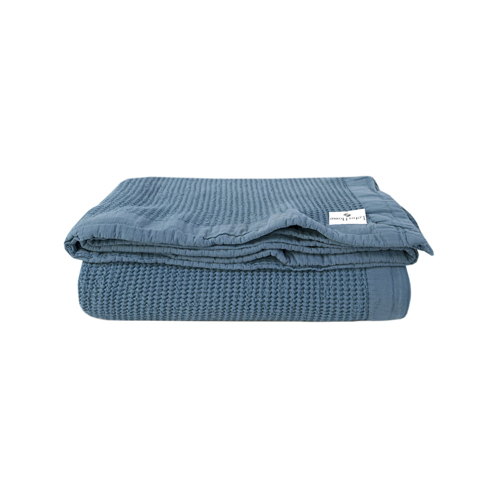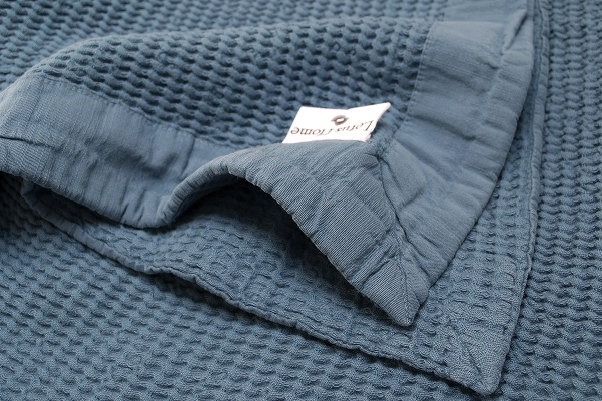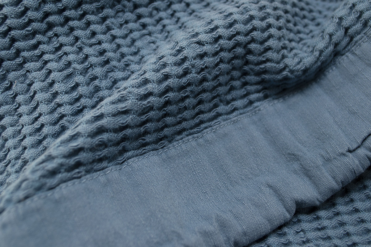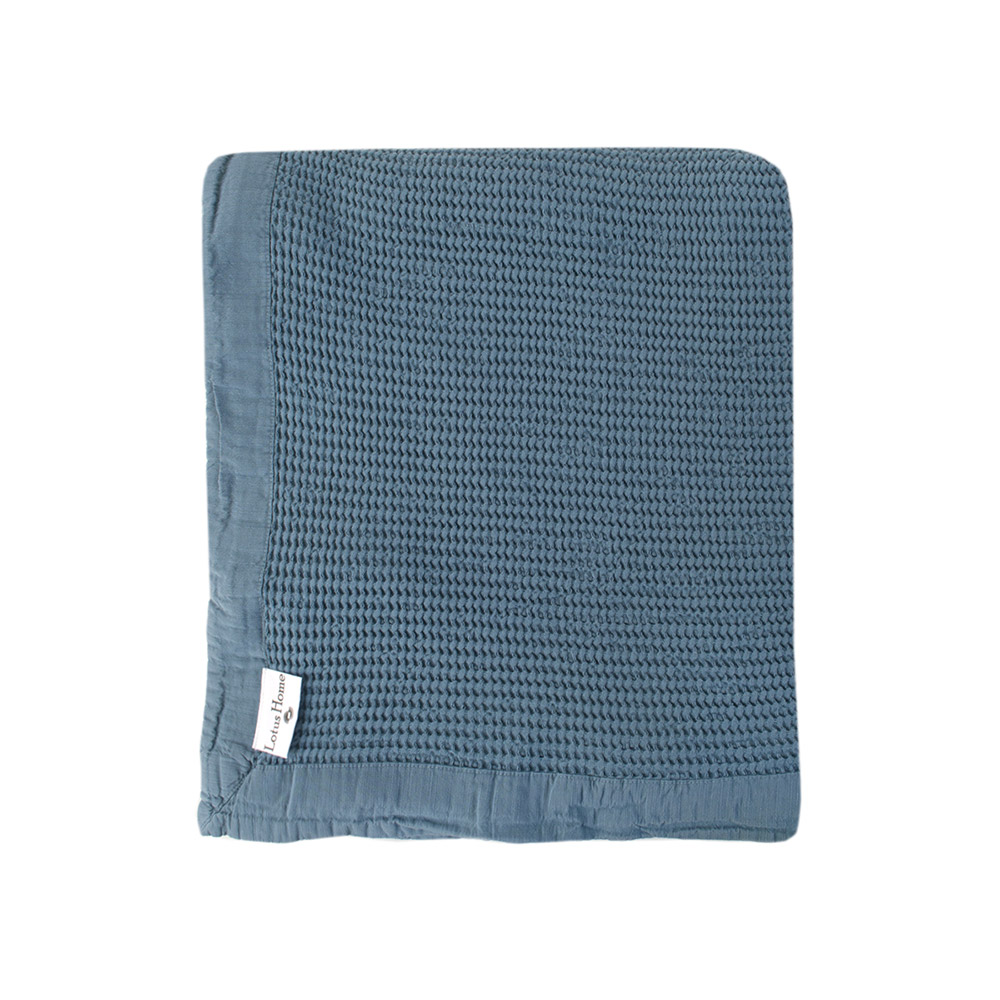 Однотонне легке покривало темно-бірюзового кольору з красивою рельєфною текстурою. Покривало чудово доповнить будь-який інтер'єр, стане стильним акцентом у кімнаті. Покривало виконано з якісного матеріалу на основі натуральних волокон бавовни і бамбука. Матеріал м'який, приємний на дотик, дарує відчуття комфорту.