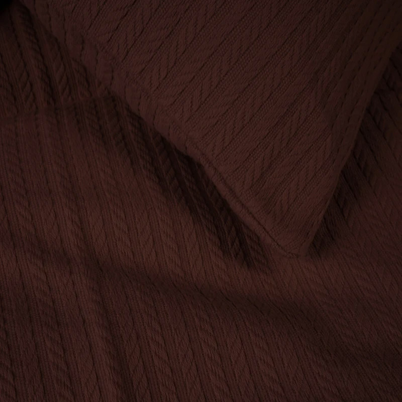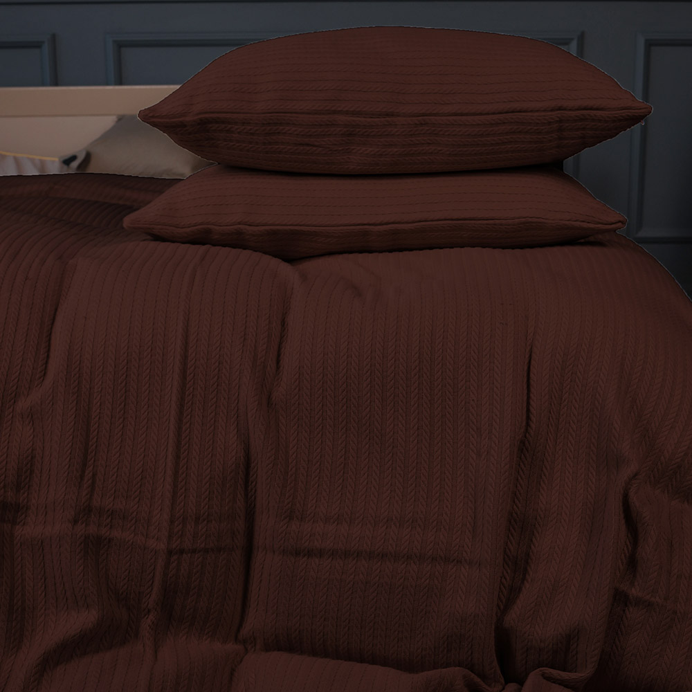 Стильний набір із покривала і двох наволочок. Однотонний коричневий колір у поєднанні з рельєфними смужками має елегантний і красивий вигляд.