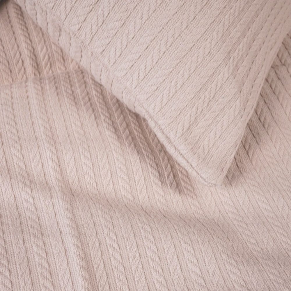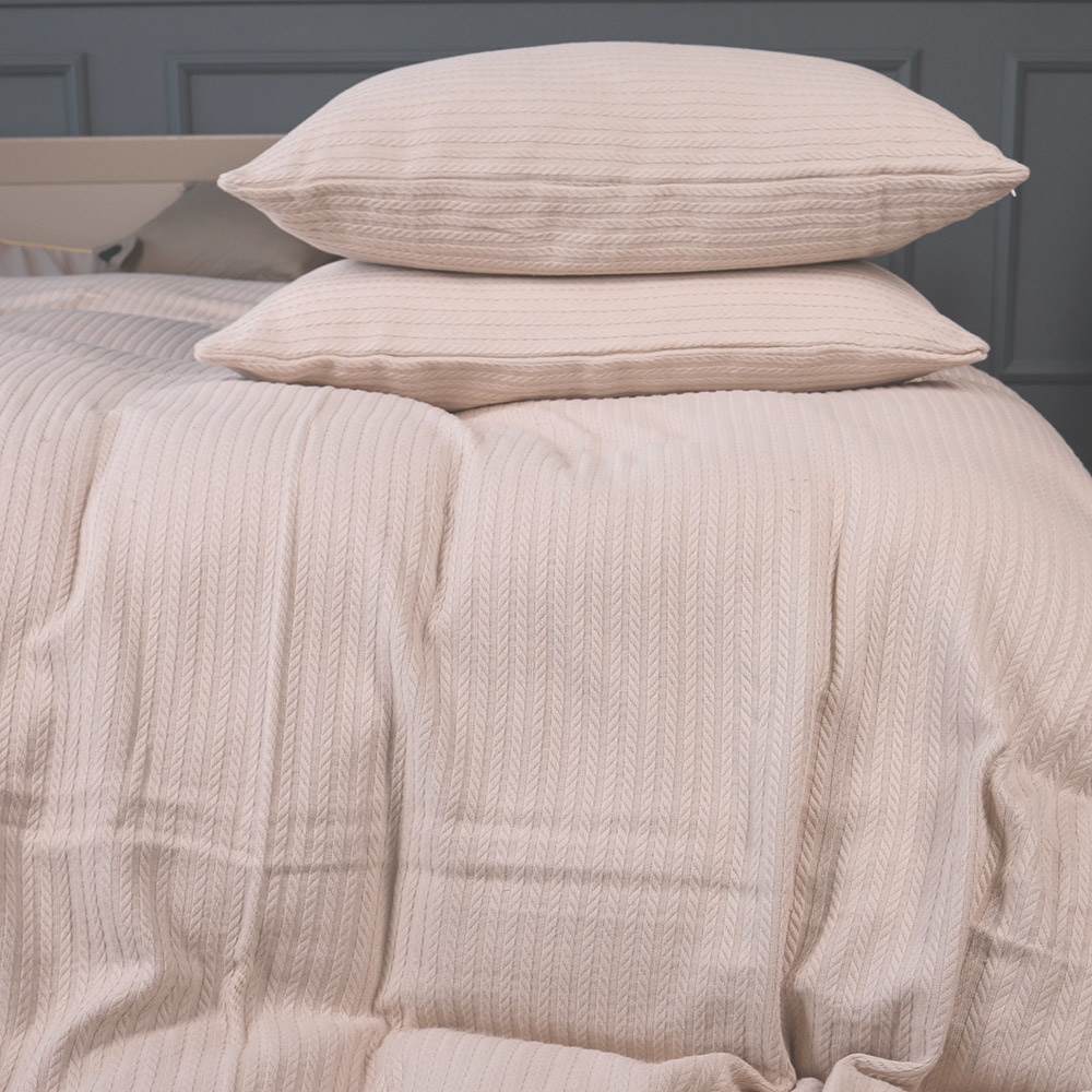Стильний набір із покривала і двох наволочок. Однотонний кремовий колір у поєднанні з рельєфними смужками має елегантний і красивий вигляд.