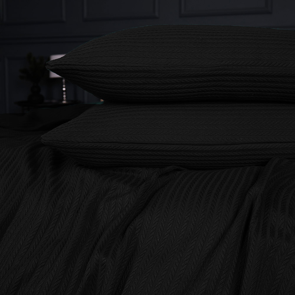 Стильний набір із покривала і двох наволочок. Однотонний чорний колір у поєднанні з рельєфними смужками має елегантний і красивий вигляд.