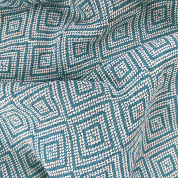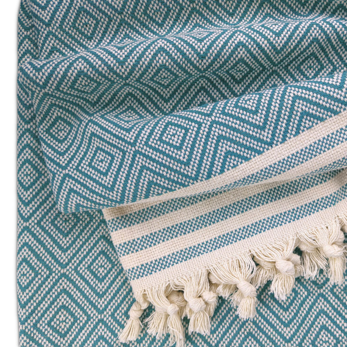 Бавовняний текстурний плед бірюзового кольору з бахромою, красивим візерунком з ромбами і смужками. Плед виконаний з натуральної бавовняної тканини. Матеріал м'який і приємний на дотик, добре пропускає повітря, дарує відчуття затишку і комфорту.