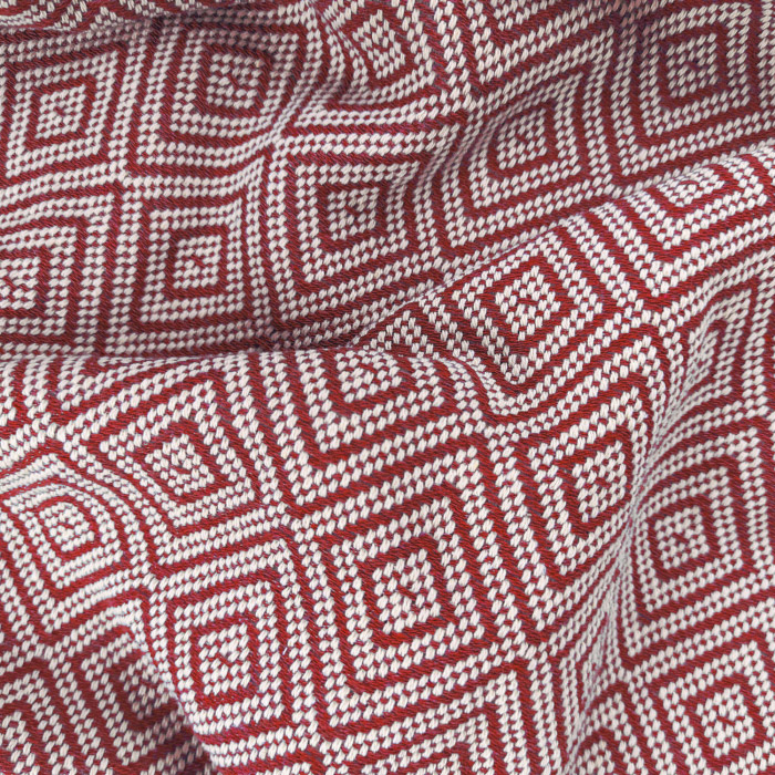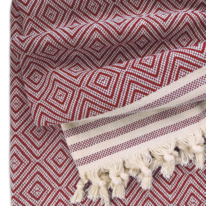 Бавовняний текстурний плед червоного кольору з бахромою, красивим візерунком з ромбами і смужками. Плед виконаний з натуральної бавовняної тканини. Матеріал м'який і приємний на дотик, добре пропускає повітря, дарує відчуття затишку і комфорту.