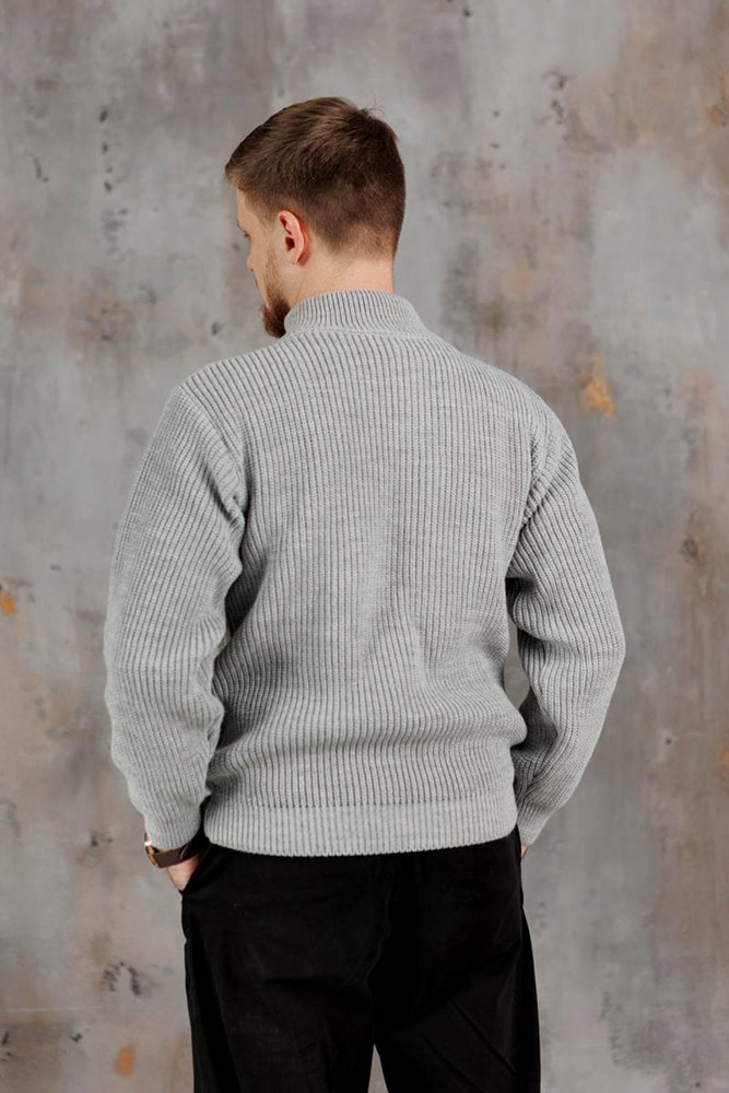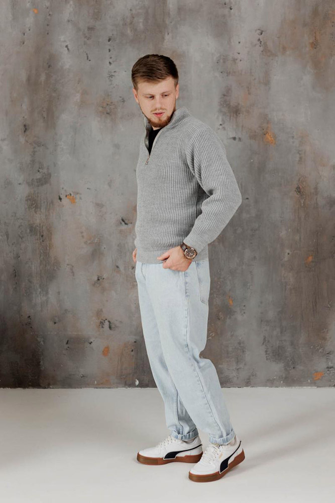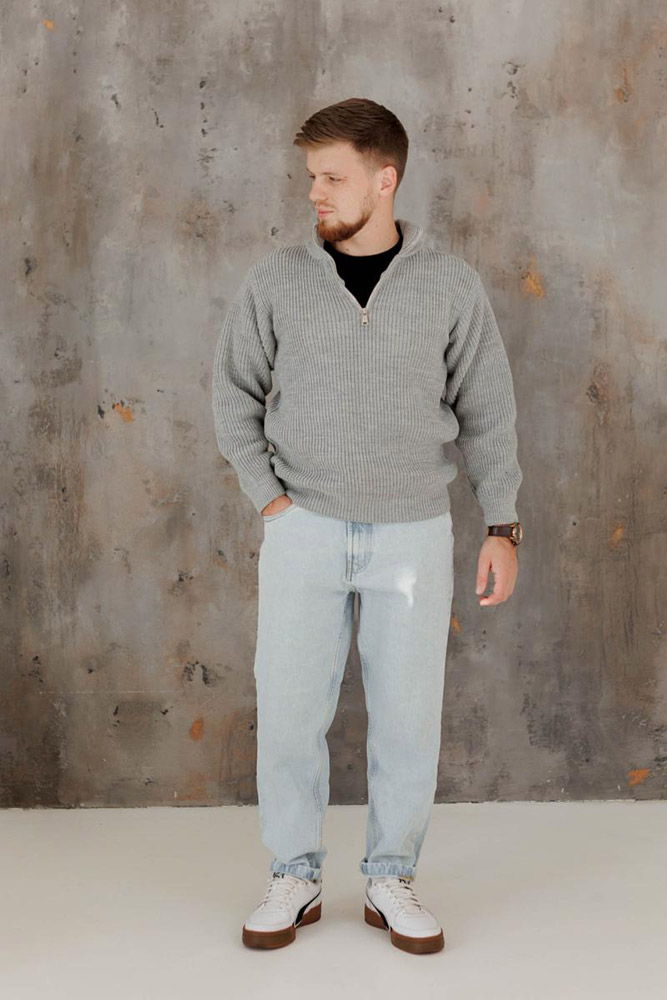 Чоловічий в'язаний светр, однотонний, сірого кольору — практичний і стильний варіант для прохолодної погоди. Модель оснащена зручною застібкою-блискавкою на грудях, яка додає функціональності. Светр виконаний з м'якої і щільної акрилової пряжі, приємної до тіла і забезпечує комфорт протягом усього дня. Матеріал добре зберігає тепло і форму, простий у догляді і підходить для повсякденного носіння.