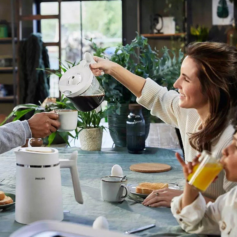 Кавоварка від Philips являє собою функціональне рішення з компактним дизайном. Функція Aroma Twister рівномірно розподіляє каву в глечику, зберігаючи насичений аромат. Ємність 1,2 літра дає змогу приготувати від 2 до 10 великих або 15 маленьких чашок кави. Функція "крапля-стоп" запобігає проливанню кави, а автоматичне вимкнення після 30 хвилин економить енергію. Зручний індикатор рівня води допомагає контролювати заповнення резервуара. Кавоварка виготовлена з екологічно чистого біопластику та має стильний мінімалістичний дизайн.