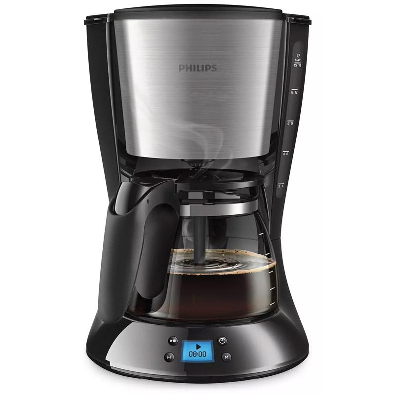 Особливості:індикатор рівня води, скляний графин, таймер, підсвічування, протикраплинна система, відсік для зберігання шнура, знімний тримач фільтра для кави, повністю знімна варильна група для зручного очищення