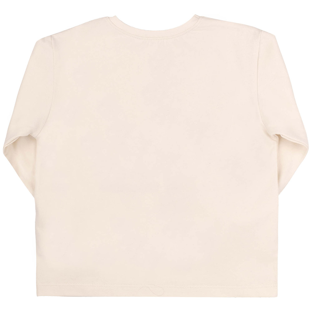 Лонгслів ніжного молочного кольору, спереду красивий принт. Модель прямого крою, з круглою горловиною і довгими рукавами на широких манжетах.