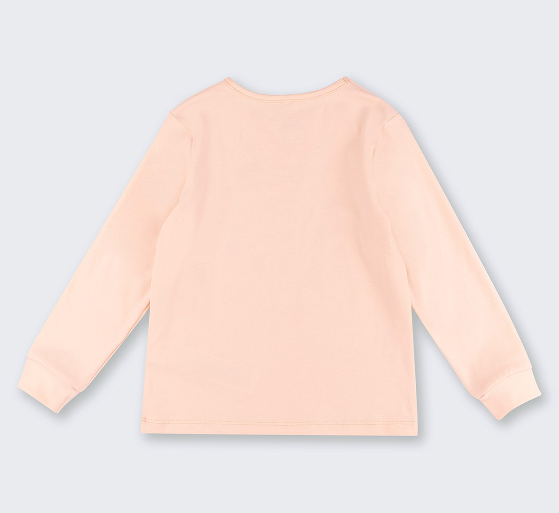 Лонгслів ніжного персикового кольору, спереду симпатичний принт. Модель із круглою горловиною та довгими рукавами.