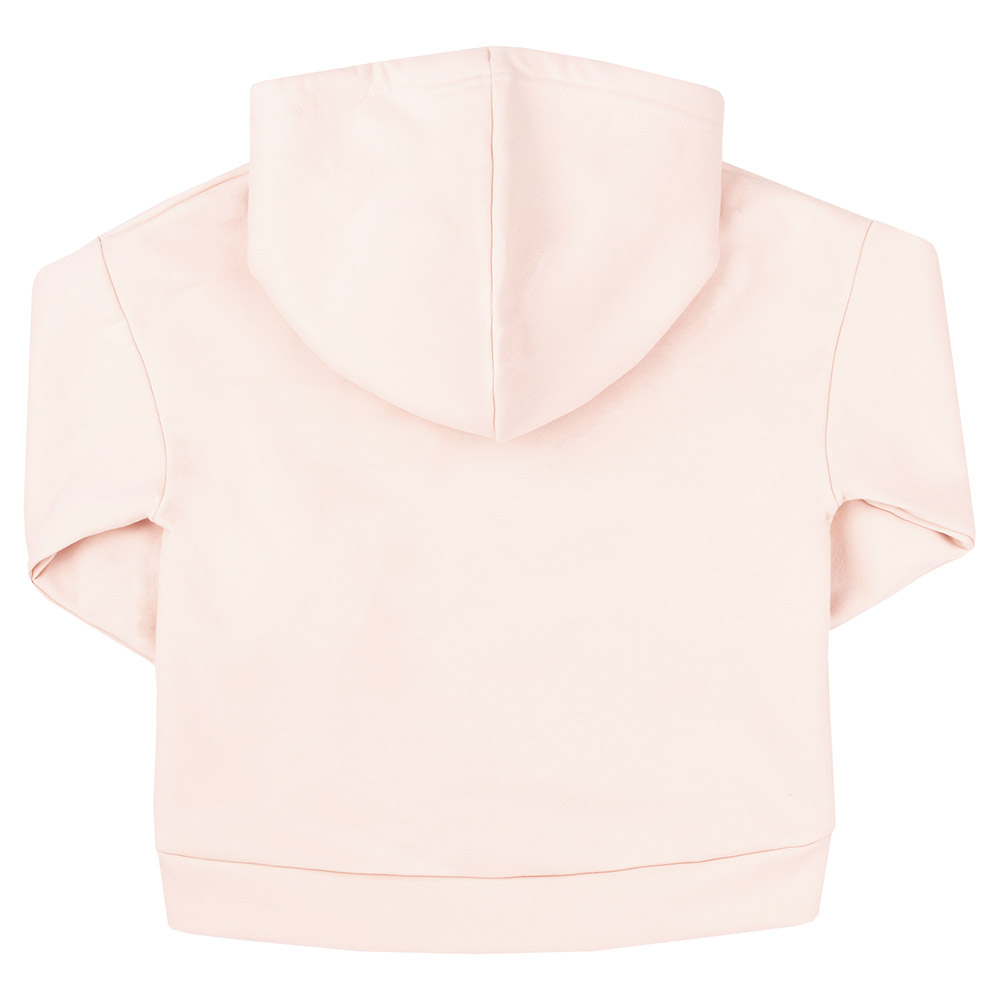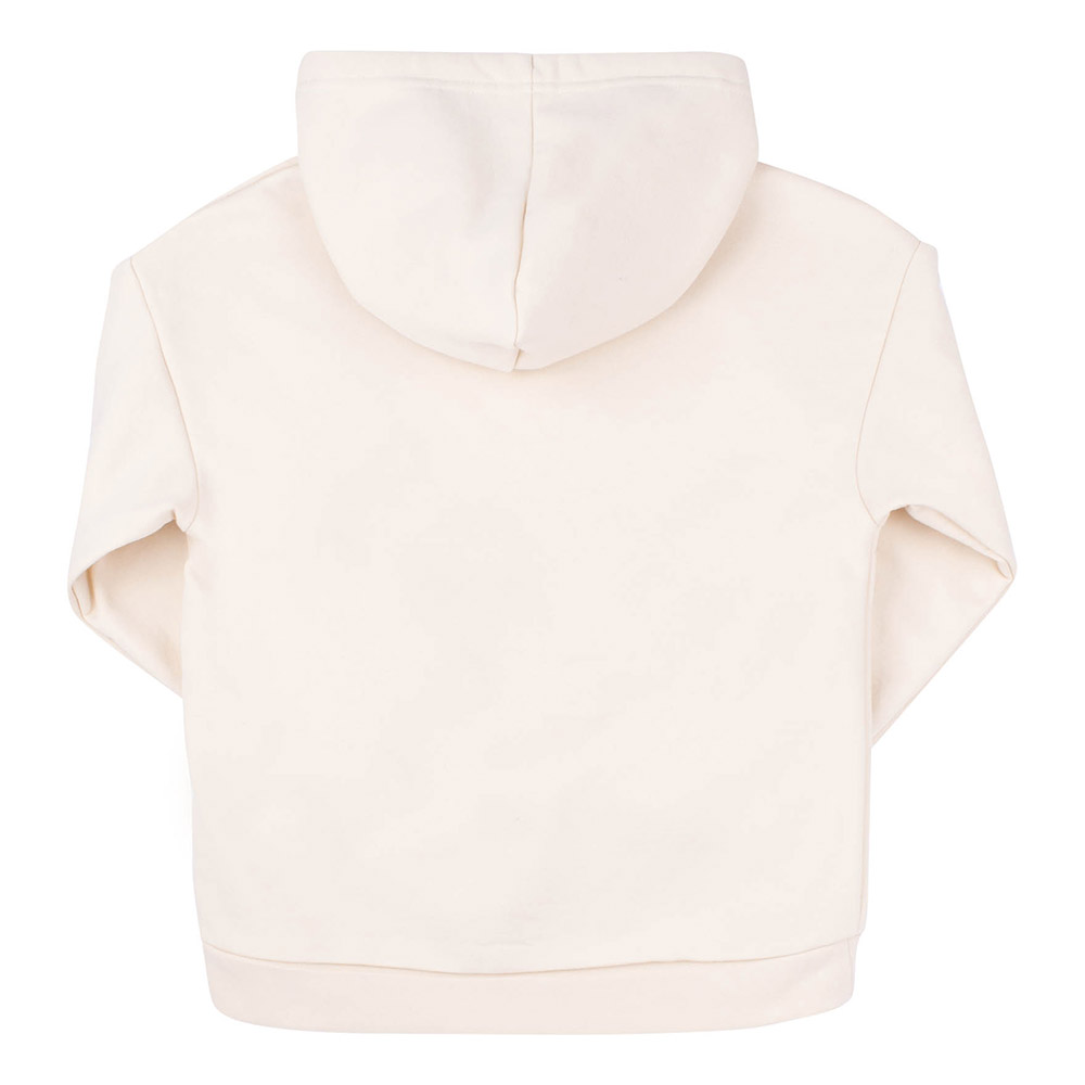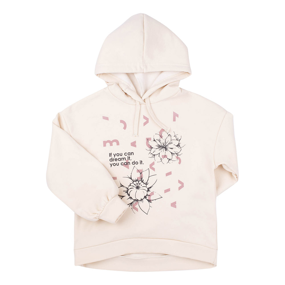 Трикотажне худі ніжного молочного кольору з капюшоном. Спереду симпатичний принт. Модель підійде для дівчинки. Худі виконано з утепленої трикотажної тканини з начосом. Матеріал з бавовни з додаванням поліестеру м'який і приємний, комфортний і теплий, практичний, ідеально підійде для повсякденного носіння.