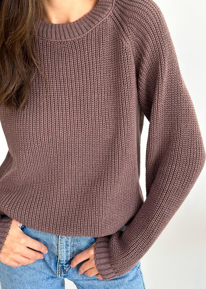Однотонний в'язаний джемпер шоколадного кольору. Джемпер чудово доповнить спідницю або штани, стане відмінною базою для створення модного і стильного образу, підійде для повсякденного носіння. Джемпер м'який, приємний до тіла, затишний і комфортний, виконаний з натуральної бавовняної пряжі високої якості.