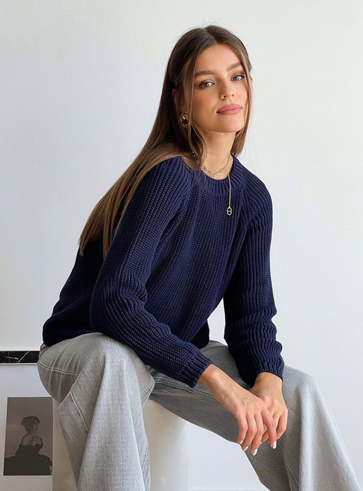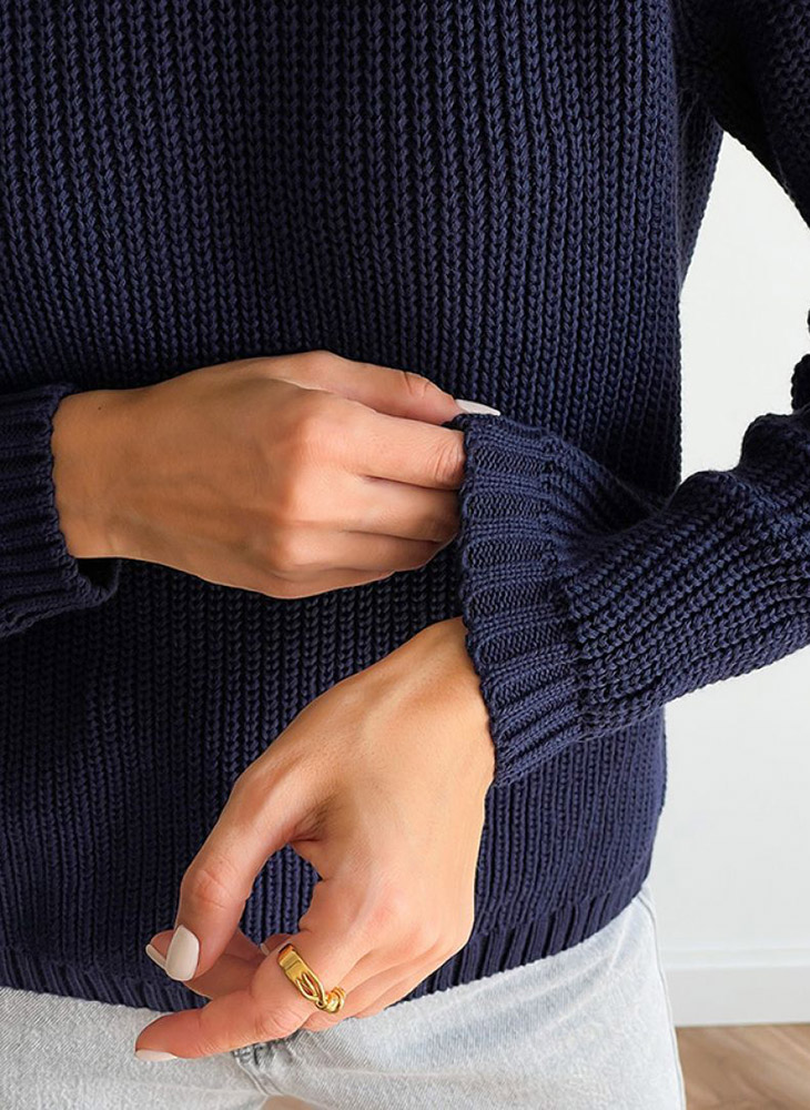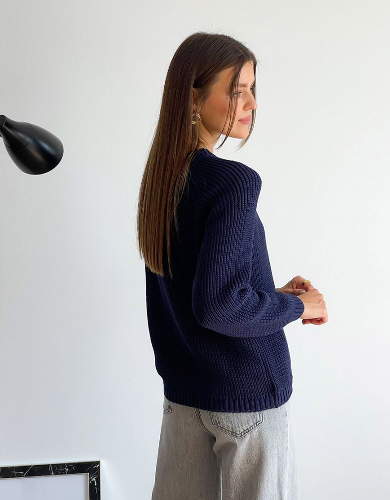 Однотонний трикотажний джемпер темно-синього кольору з довгими рукавами. Джемпер чудово доповнить спідницю або штани, стане чудовою базою для створення модного та стильного образу, підійде для повсякденного носіння. Джемпер м'який, приємний до тіла, затишний та комфортний, виконаний з натуральної бавовняної пряжі високої якості.