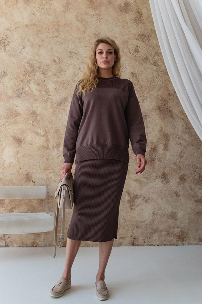 Однотонний стильний джемпер шоколадного кольору з бічними розрізами і довгими рукавами. Модель машинної в'язки, злегка вільного силуету. Джемпер відмінно підійде для повсякденного носіння, стане красивим акцентом у гардеробі. Матеріал з бавовни та акрилу м'який, приємний до тіла, не парить, відмінно пропускає повітря.