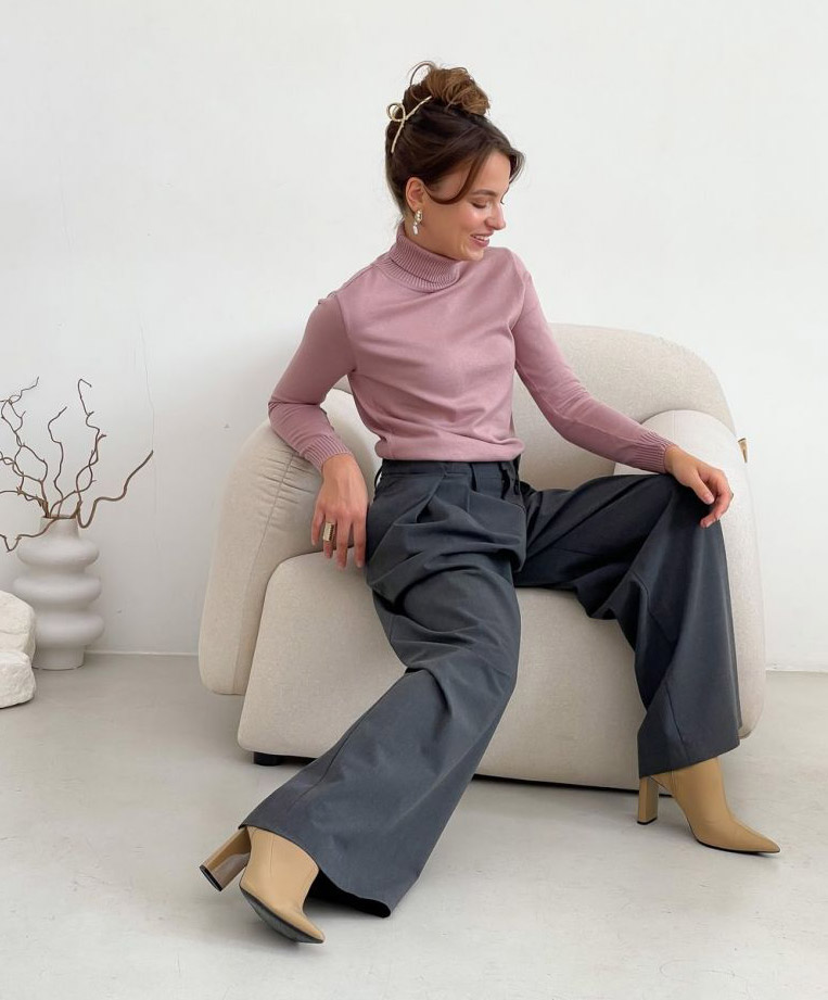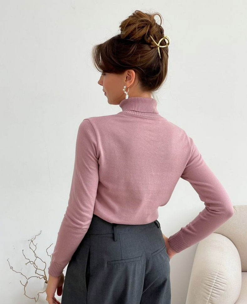 Однотонний трикотажний гольф кольору пудри з високим воротом і довгими рукавами. Гольф чудово доповнить спідницю або штани, стане хорошою базою для створення модного та стильного образу. М'який і приємний на дотик матеріал з бавовни та акрилу забезпечує затишок та комфорт, відмінно підходить для повсякденного носіння.