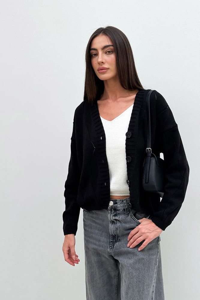 Стильний однотонний кардиган чорного кольору з красивим ажурним візерунком. Модель укорочена, з довгими рукавами, по центру застібається на ґудзики. Кардиган чудово підійде для створення затишних образів, стане гарним акцентом у гардеробі, відмінно доповнить джинси, штани, спідницю або сукню. Однотонний дизайн робить кардиган універсальним, легко поєднується з іншим одягом і аксесуарами. Пряжа з бавовни та акрилу приємна до тіла, затишна, забезпечує комфорт, водночас міцна та довговічна в експлуатації.