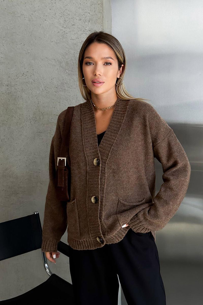 Однотонний в'язаний кардиган коричневого кольору з двома великими накладними кишенями і з центральною застібкою на ґудзики. Модель вільного крою, затишна і тепла. Кардиган чудово доповнить спідницю або штани, стане відмінною базою для створення модного і стильного образу, підійде для повсякденного носіння. Кардиган м'який, приємний до тіла, комфортний, виконаний з якісної пряжі на основі вовни та акрилу.