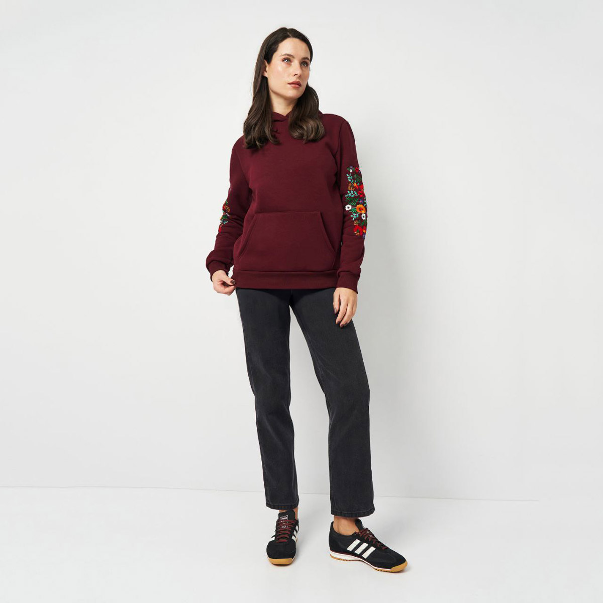 Жіноче худи Магнолія від Lesia бордове – класичне худи з м'якого та теплого трикотажу тринитка чесана. Вільний крій, велика кишеня-кенгуру, манжети із еластичного полотна. Яскрава машинна вишивка на рукавах зберігає вигляд після прання. Бордовий колір легко поєднується із базовим гардеробом. Ідеально для повсякденного носіння у місті та на відпочинку.