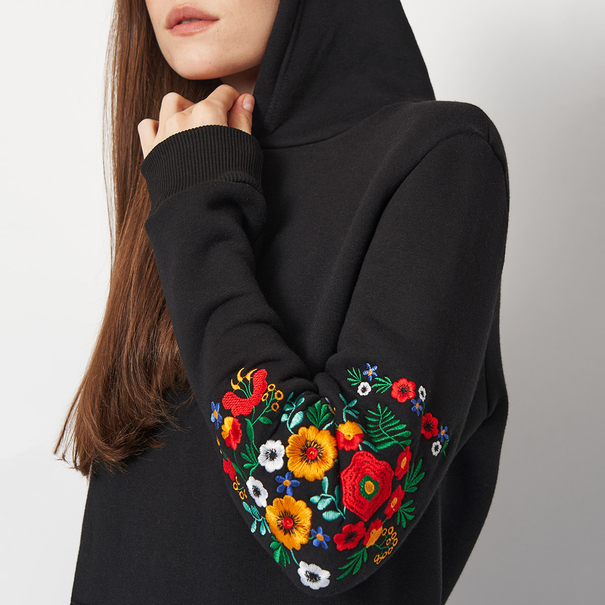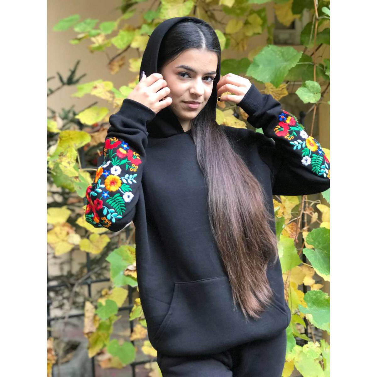 Жіноче худи Магнолія від ТМ Lesia – класичне худи з м'якого та теплого трикотажу. Вільний крій, велика кишеня-кенгуру, манжети із еластичного полотна. Яскрава машинна вишивка на рукавах зберігає вигляд після прання. Чорний колір легко поєднується із базовим гардеробом. Ідеально для повсякденного носіння у місті та на відпочинку.