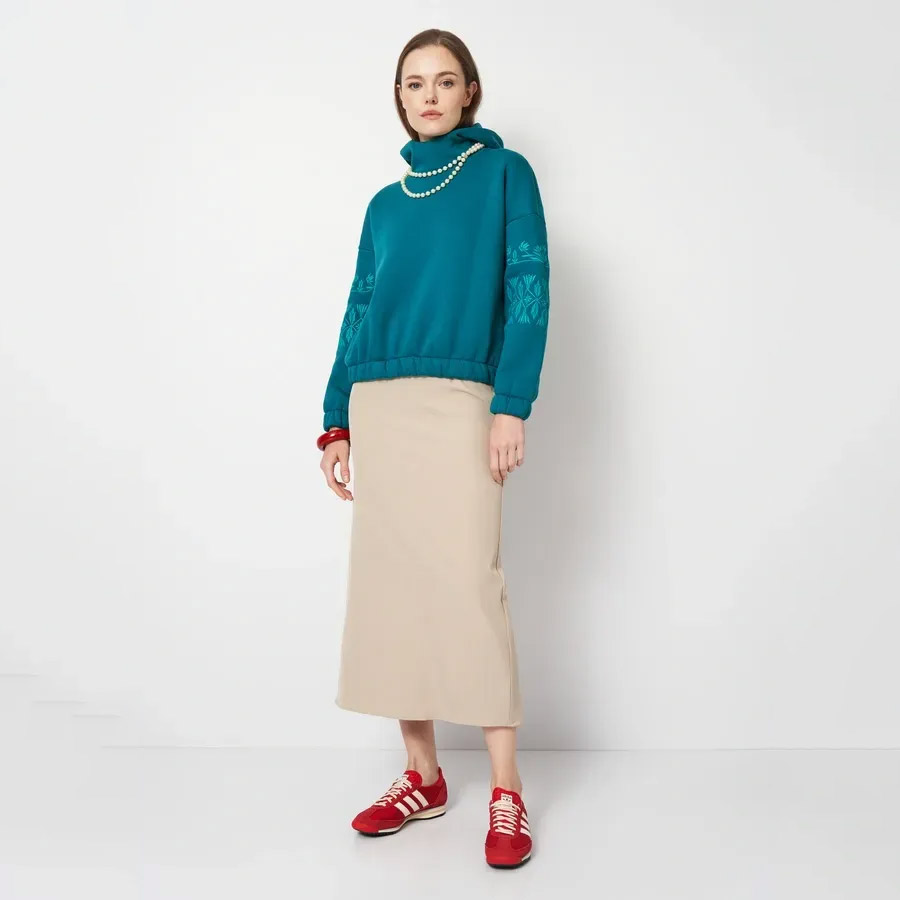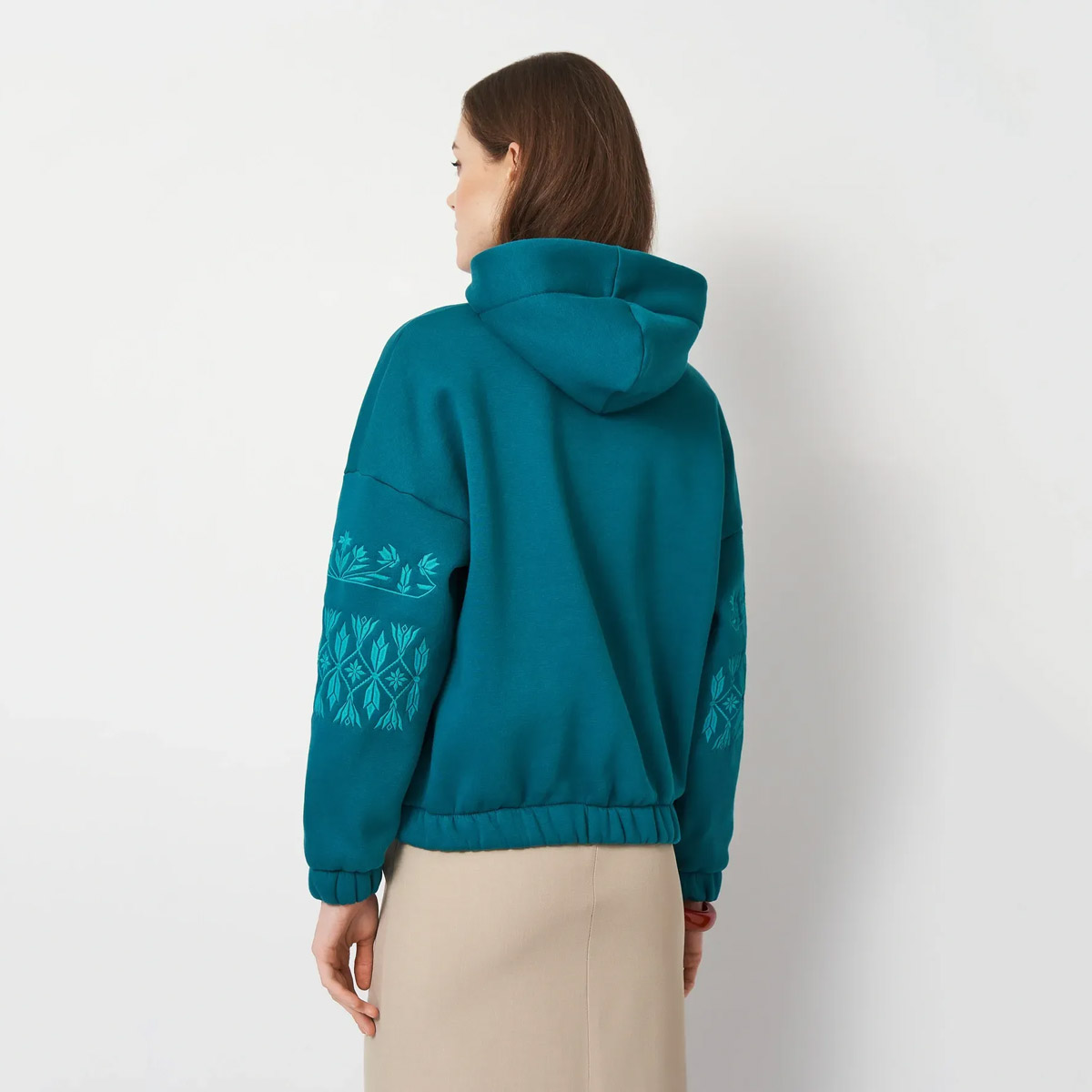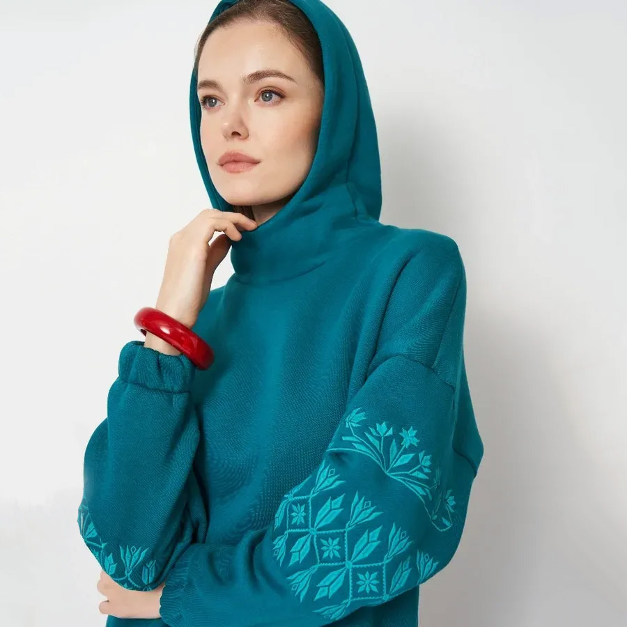 Жіноче худі вільного крою з вишивкою на резинці. Виконано з м'якої і теплої трикотажної тканини тринитка чесана, яка добре тримає форму і пропускає повітря. Особливості: спущене плече, стильний капюшон, бічні приховані кишені, низ і рукава на м'якій гумці. Яскрава машинна вишивка гладдю зберігає вигляд після прання. Ідеально для повсякденного носіння в місті або на відпочинку, поєднуючи комфорт і естетику української вишивки.