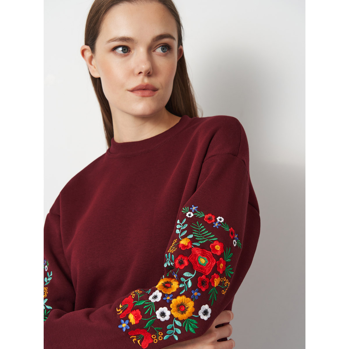Жіночий світшот від ТМ Lesia бордового кольору з вишивкою — комфортна модель з м'якого гребенного футера тринитка чесана. Матеріал зберігає тепло, не скочується і добре тримає форму. Спущене плече та яскрава машинна вишивка на рукавах надають образу виразності. Класичний колір бордо легко поєднується з базовими речами, а модель підходить для повсякденного носіння в місті та на відпочинку.