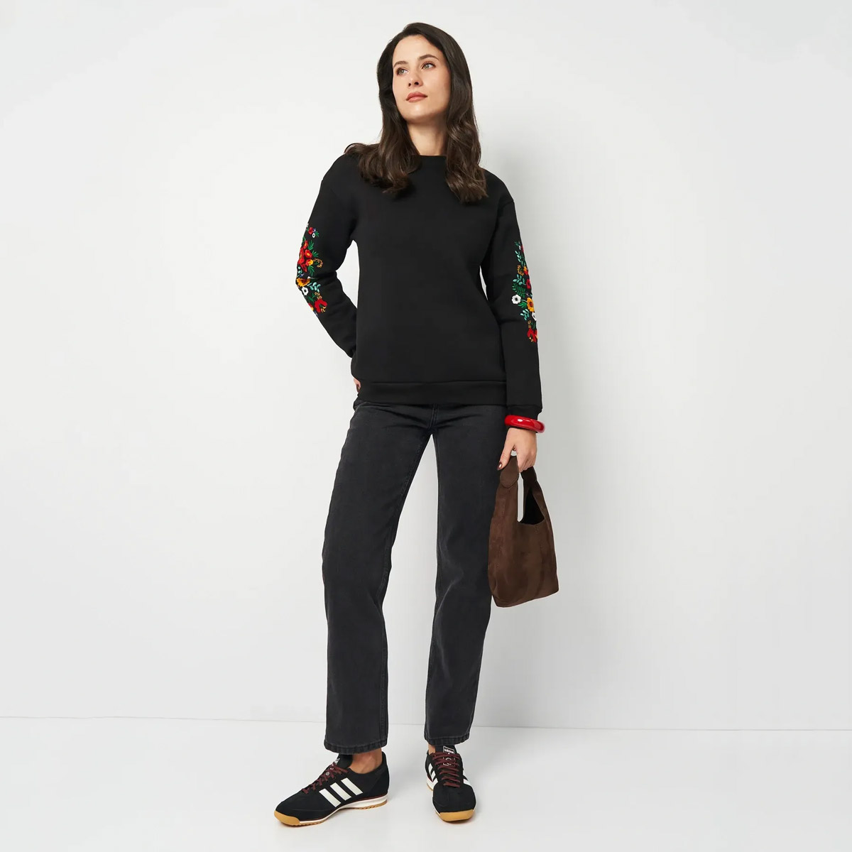 Жіночий світшот від ТМ Lesia чорного кольору — модель класичного крою з м'якого футера. Матеріал зберігає тепло, не скочується і добре тримає форму. Спущене плече та яскрава машинна вишивка на рукавах надають образу виразності. Світшот поєднує спортивний комфорт з естетикою української вишивки та підходить для повсякденного носіння у місті та на відпочинку.