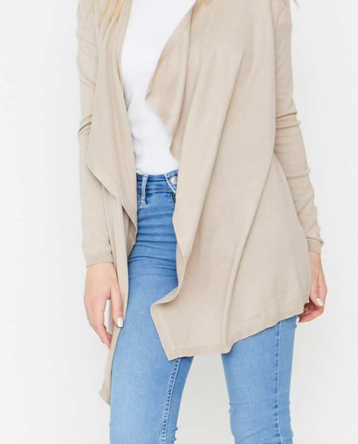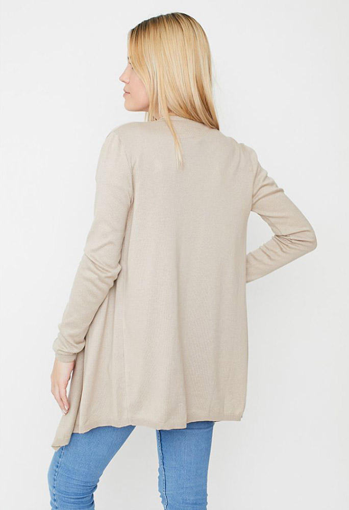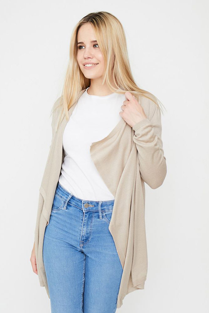 Однотонний бежевий кардиган з легкого якісного матеріалу. Модель вільного силуету, без кишень і без пояса. Кардиган чудово доповнить гардероб, створить ніжний жіночний образ. Матеріал з бавовни та акрилу приємний до тіла, не париться, відмінно пропускає повітря, ідеально підходить для повсякденного носіння.