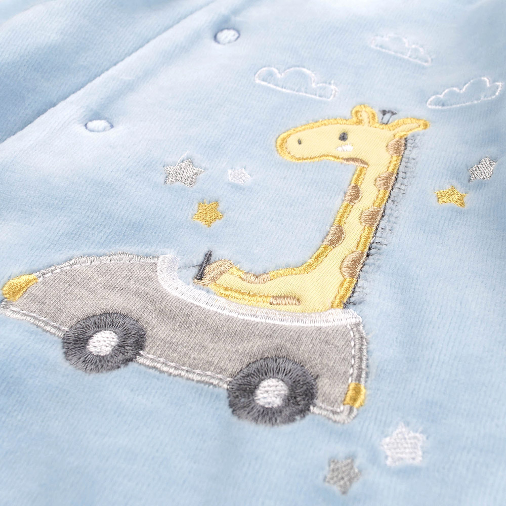 Велюровий комбінезон блакитного кольору, спереду симпатична вишивка. Модель підійде для хлопчика. Комбінезон по всій довжині застібається на кнопки, ніжки закриті. Комбінезон виготовлено з якісного велюру. Тканина м'яка, приємна на дотик, комфортна і затишна для малюка.