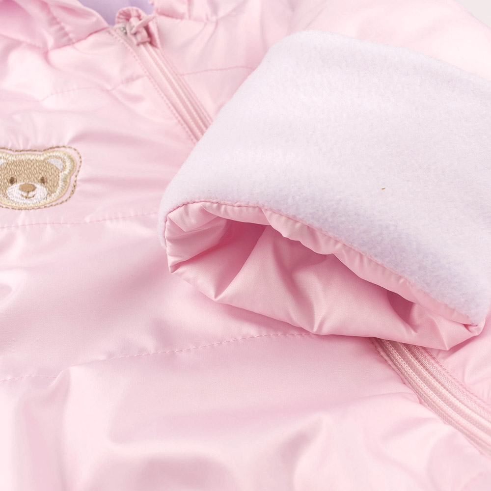 Комбінезон ніжного рожевого кольору, декорований вишивкою з ведмедиком. Модель із застібкою-блискавкою, капюшон із симпатичними вушками. Модель підійде для дівчинки.