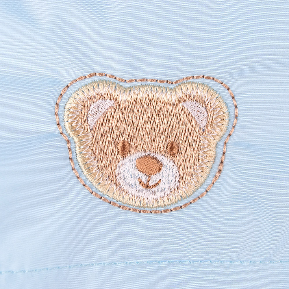 Комбінезон блакитного кольору, декорований вишивкою з ведмедиком. Модель із застібкою-блискавкою, капюшон із симпатичними вушками. Модель універсальна, підійде і для хлопчика, і для дівчинки.