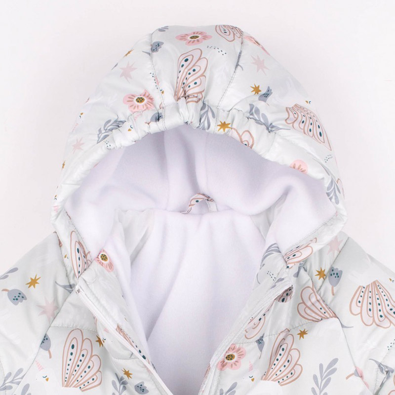 Костюм зимовий стьобаний (куртка і напівкомбінезон). Куртка світло-сірого кольору з симпатичним квітковим принтом, з центральною застібкою-блискавкою, вшивними кишенями і капюшоном. Напівкомбінезон однотонний, сірого кольору, з центральною застібкою-блискавкою та еластичними бретелями на регуляторах. Комплект виконаний з водовідштовхувальної плащової тканини з флісовою підкладкою, пошитий на утеплювачі "Comforcold" (Німеччина). Комплект стане незамінним для холодних зимових днів, подарує малюкові тепло і комфорт.