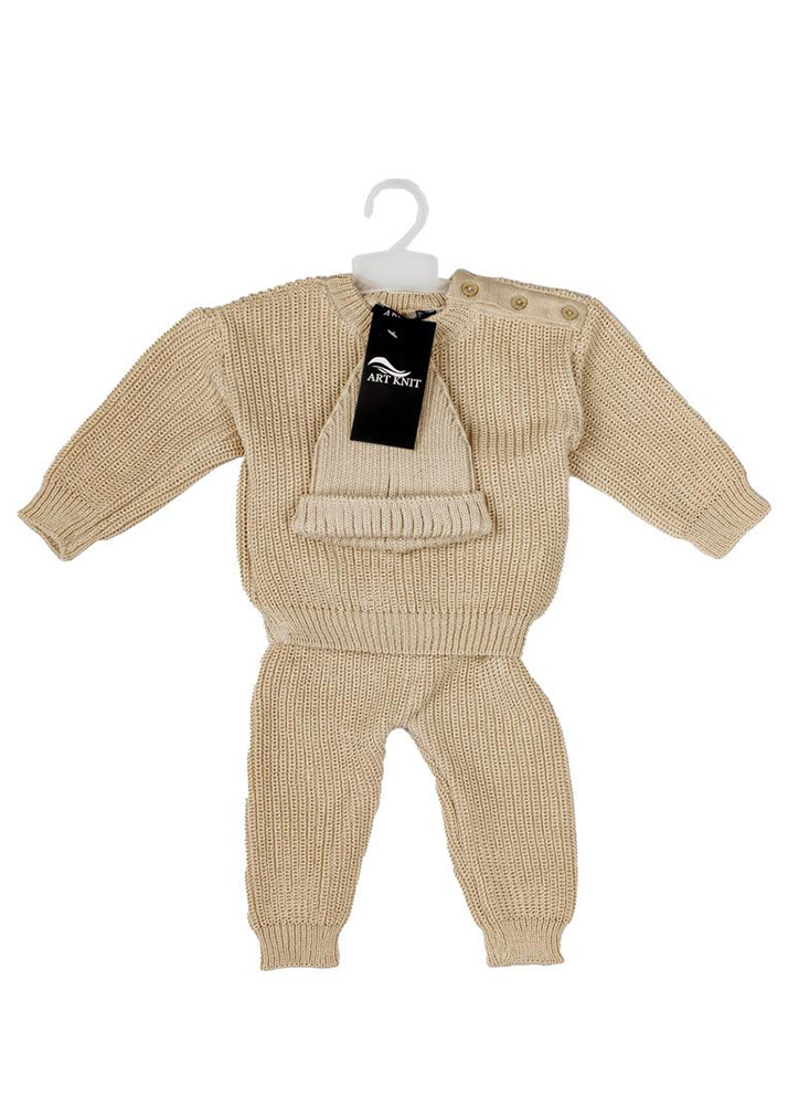 Чудовий в'язаний набір бежевого кольору. Комплект для малюків складається з джемпера, штанців та шапочки. Модель універсальна, підійде і для хлопчика, і для дівчинки. Комплект виконаний з якісної пряжі на основі волокон натуральної бавовни та акрилу. Матеріал м'який, теплий та затишний, приємний на дотик, забезпечить малюкові комфорт.
