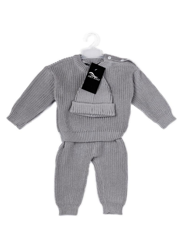Чудовий в'язаний набір сірого кольору. Комплект для малюків складається з джемпера, штанців та шапочки. Модель універсальна, підійде і для хлопчика, і для дівчинки. Комплект виконаний з якісної пряжі на основі волокон натуральної бавовни та акрилу. Матеріал м'який, теплий та затишний, приємний на дотик, забезпечить малюкові комфорт.