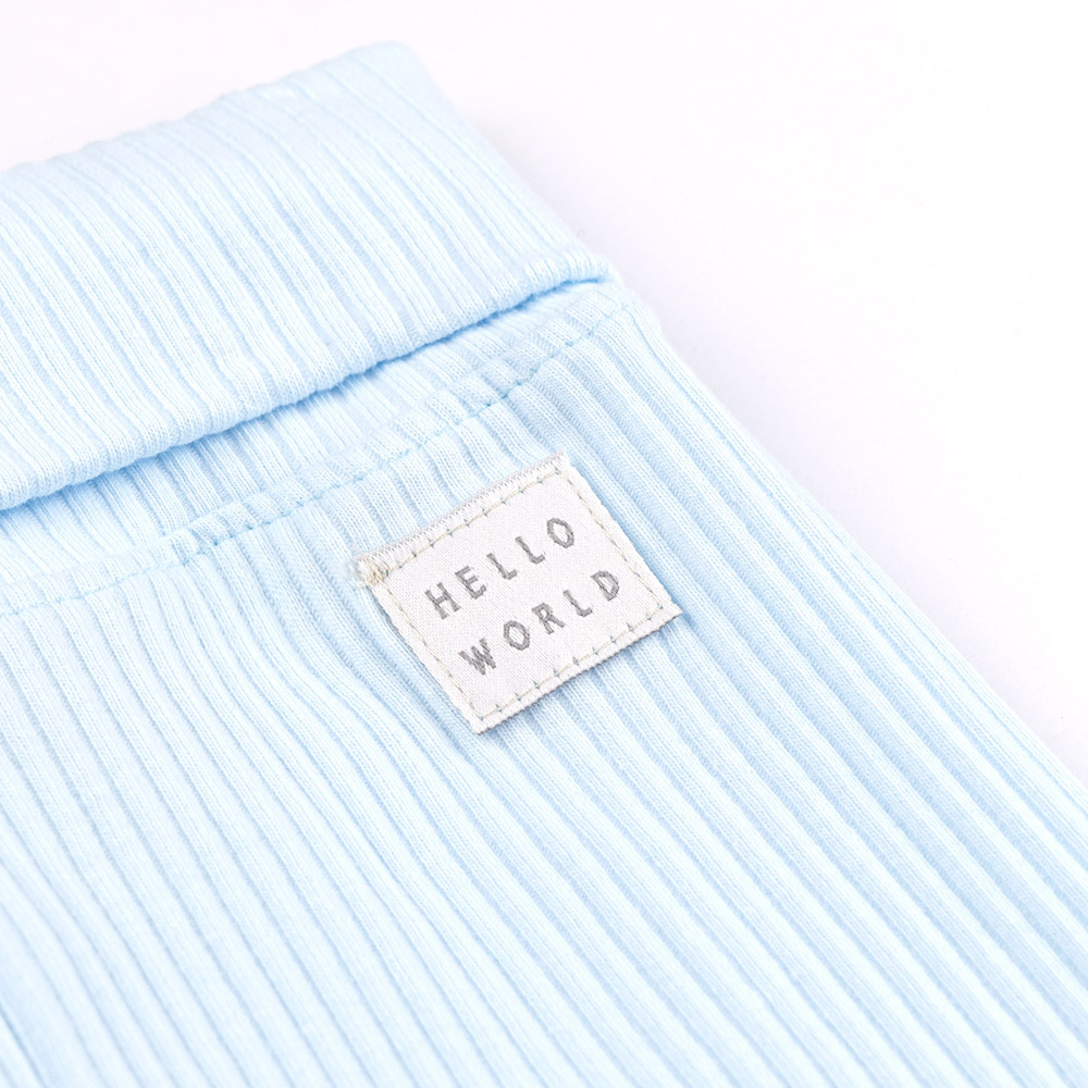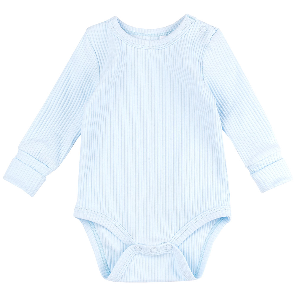 Набір блакитного кольору, виконаний з тканини трикотаж-рубчик з рельєфними смужками. Матеріал з натуральної бавовни, м'який і приємний на дотик, подарує дитині максимальний комфорт і затишок.