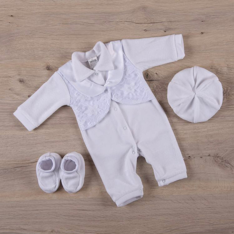 Комплект для хлопчика Голд-3 Бетіс велюр зшитий з м'якого бархатистого трікотажнго полотна. Матеріал дуже ніжний і приємний до тіла. Комбінезон-чоловічок з довгими рукавами і відкладним комірцем декорований вставкою, що імітує класичний жилет з гіпюру з атласними лацканами. Застібається на кнопки зверху до низу і між ніжок. Бере і пінетки доповнюють комплект, в якому ваш малюк буде виглядати нарядно і стильно. Відмінна ідея для подарунка батькам новонародженого.
