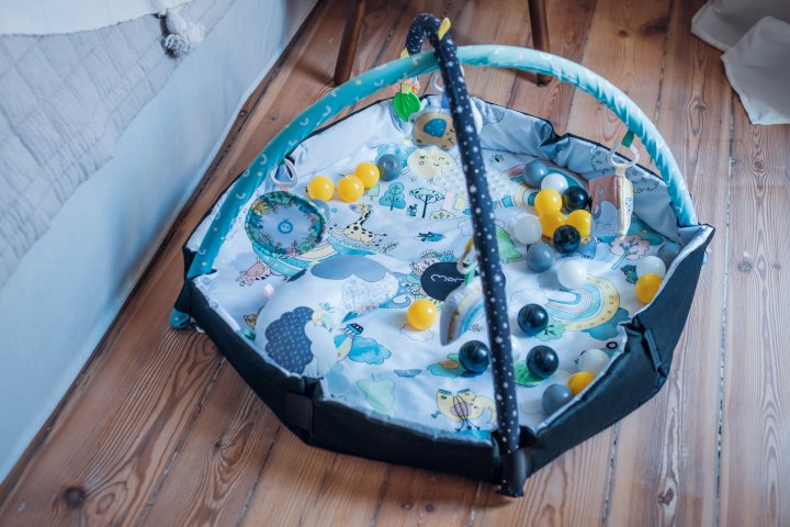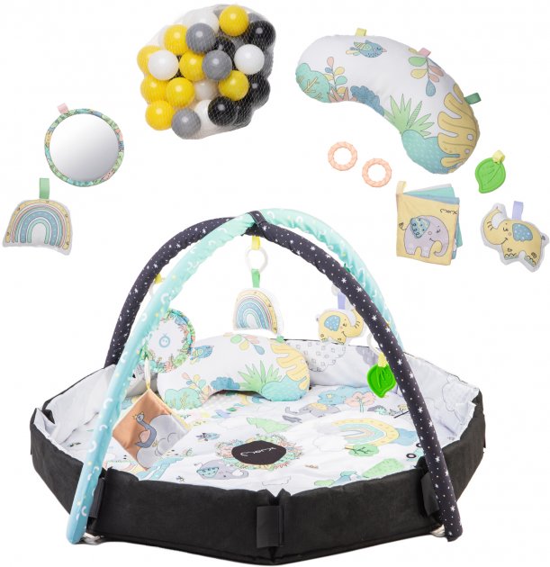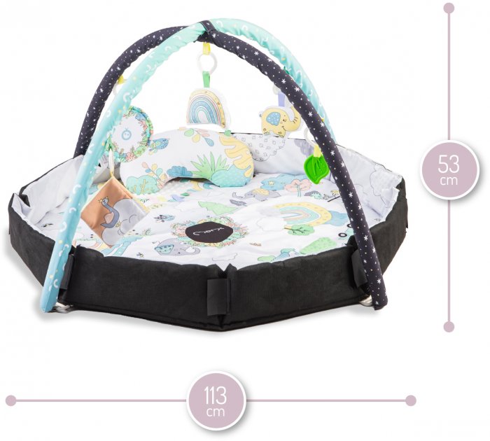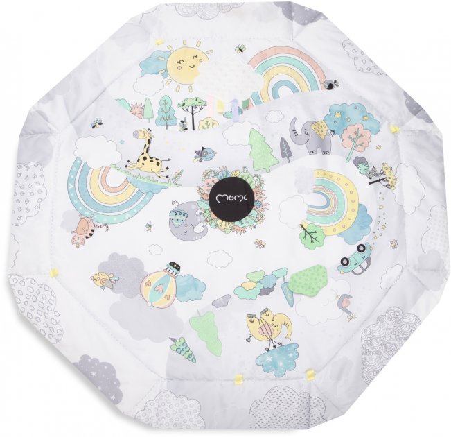 Килимок MoMi Day&Night універсальний – він виконує функцію килимка (міцні матеріали забезпечать теплоізоляцію), килимка з сенсорними елементами, що розвиває, а також, піднявши борти, килимок можна використовувати як сухий басейн з кулями (30 куль). Килимок великий за розміром – це забезпечить дитині простір під час гри. Дуги та іграшки подарують час відпочинку малюкові та його близьким.