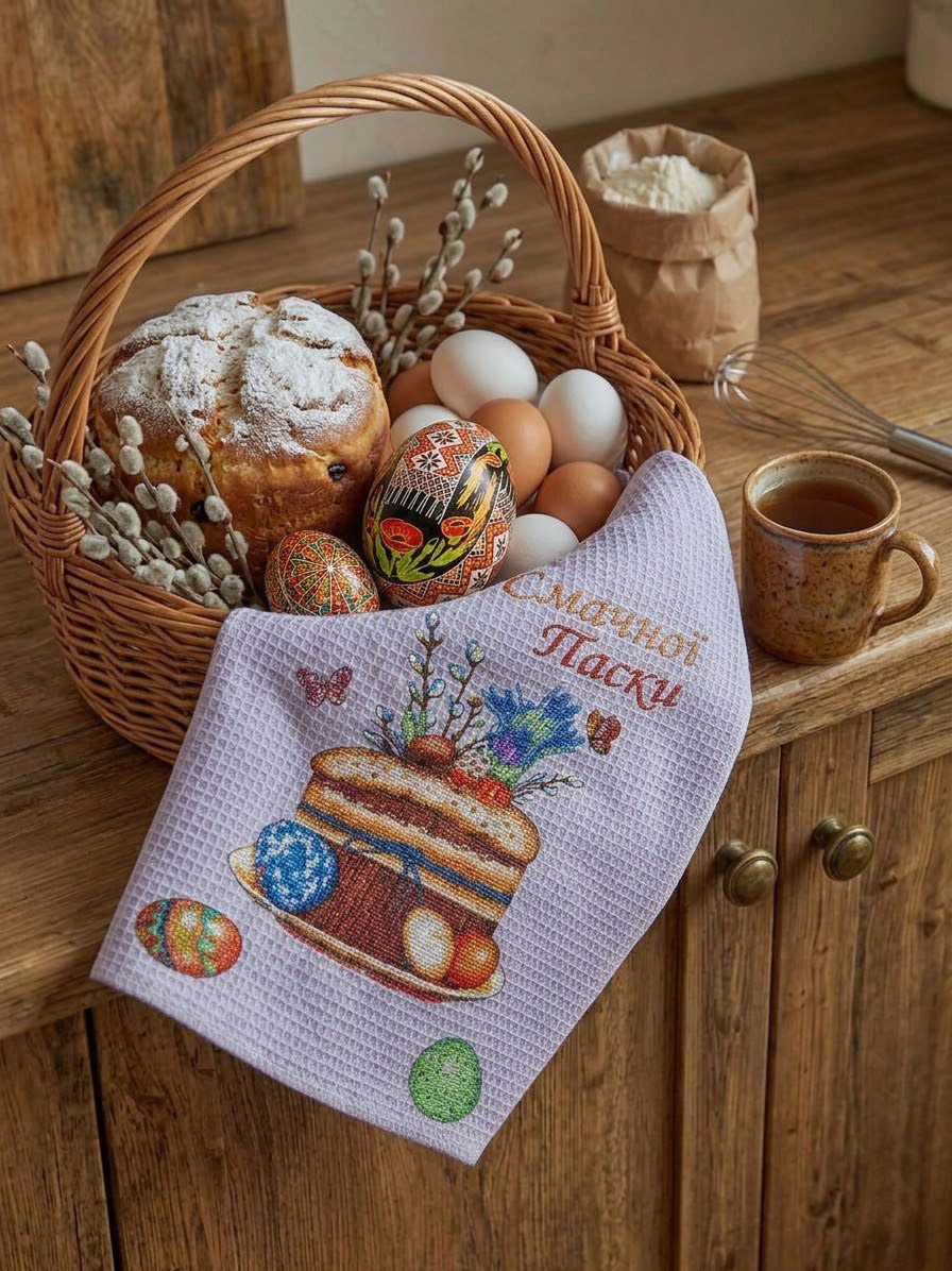 Рушник великодній вафельний "Смачної паски" Emily блакитного кольору. Виготовлений зі 100% бавовни з рельєфною вафельною фактурою, легкий, м'який і приємний на дотик. Гарний принт з паскою, квітами і писанками створює святковий настрій, ідеально підходить для великоднього декору кухні або подарунка. Рушник практичний, відмінно вбирає вологу, стане незамінним на кухні, прикрасить інтер'єр у святкові дні.