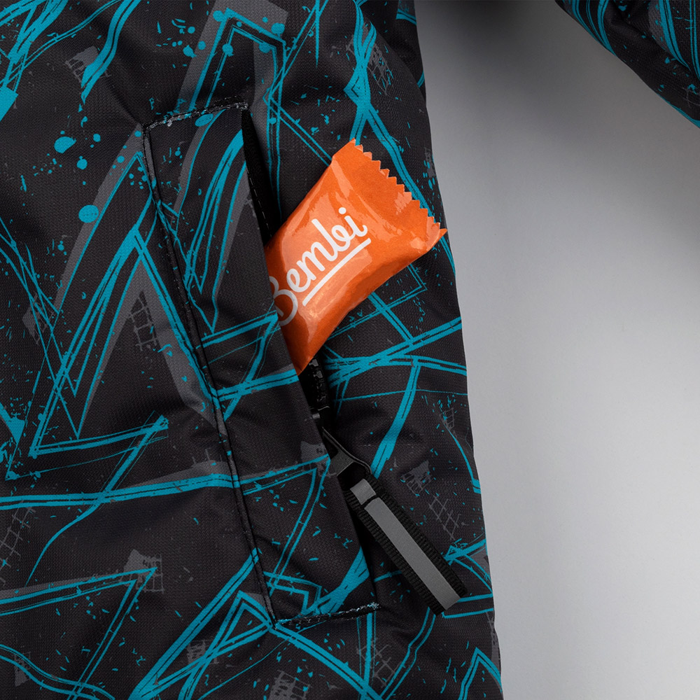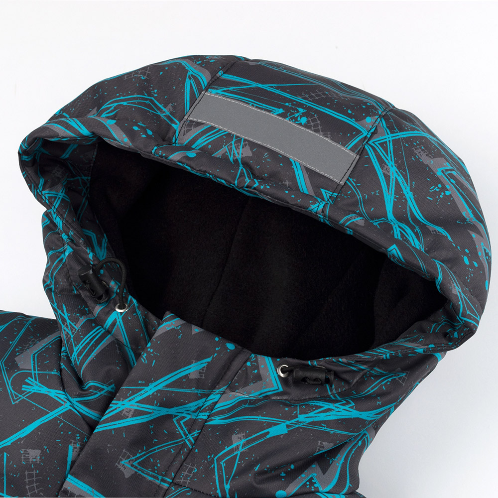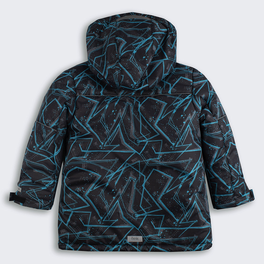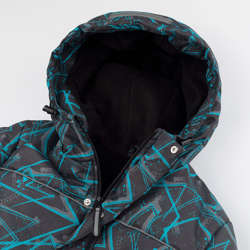 Куртка зимова чорного кольору з абстрактним бірюзовим принтом. Модель універсальна, підійде і для хлопчика, і для дівчинки. Модель з капюшоном, центральною застібкою (на блискавку і на кнопки) і з бічними кишенями. Куртка виконана з водовідштовхувальної вітростійкої плащової тканини з флісовою підкладкою і з утеплювачем. Куртка стане незамінною для холодних зимових днів, подарує дитині тепло і комфорт.