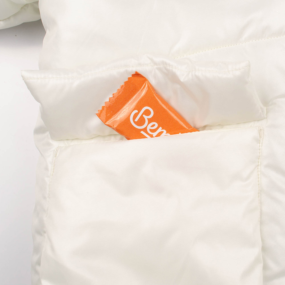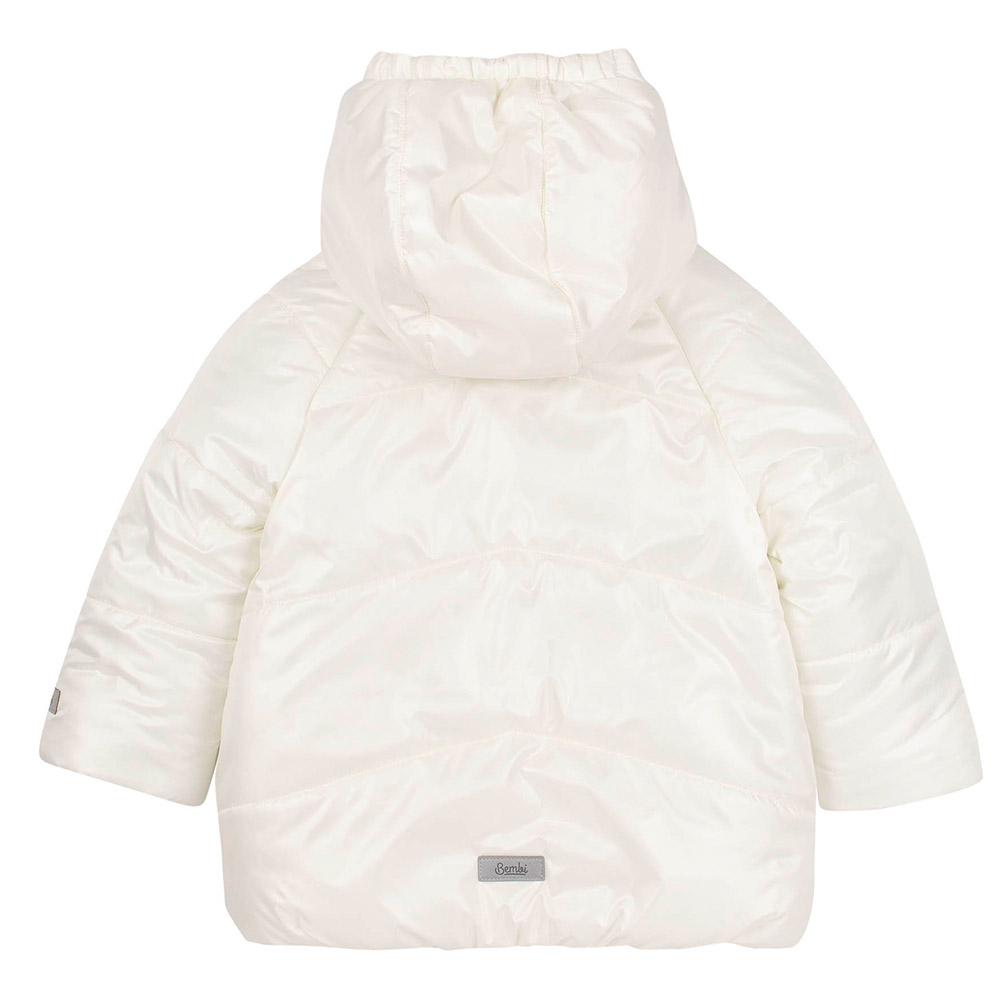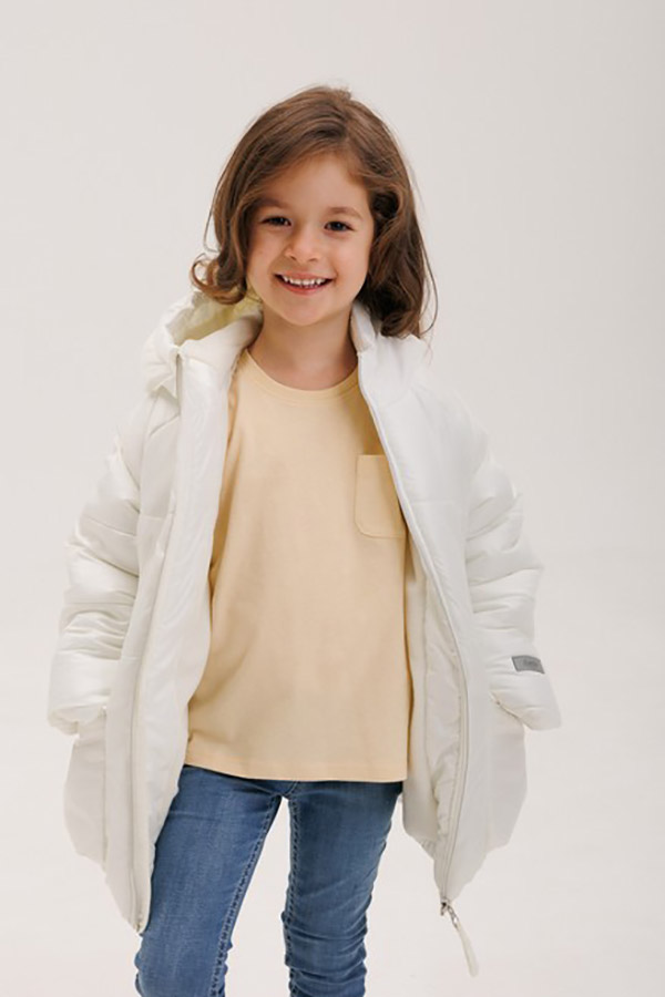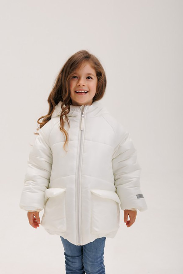 Куртка зимова стьобана з капюшоном. Модель ніжного молочного кольору, підійде для дівчинки. Модель із центральною застібкою-блискавкою та накладними кишенями з клапанами. Рукави з внутрішніми манжетами. Куртка виконана з водовідштовхувальної плащової тканини з флісовою підкладкою. Виріб пошитий на утеплювачі «Comforcold» (Німеччина). Куртка стане незамінною для холодних зимових днів, подарує дитині тепло та комфорт.