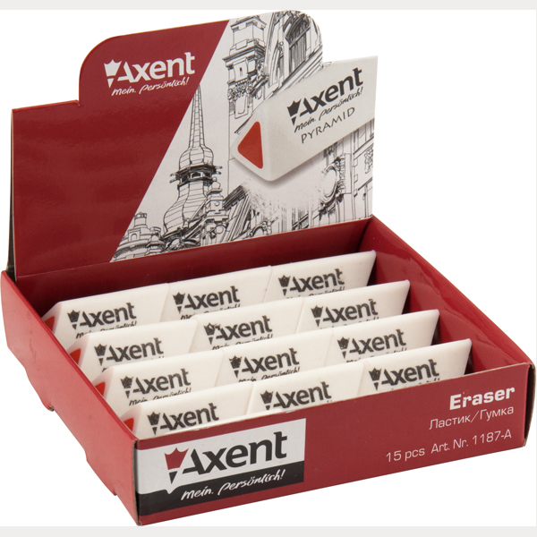 Ластик м'який Pyramid Axent +1187-A з термопластичної гуми - м'яко стирає олівцеві лінії без пошкодження паперу. Має скошені краї для найбільш точного видалення слідів графітного олівця. Завдяки сучасному матеріалу пластичний, не кришиться. Особливість гумки - незвичайна тригранна форма, яка відповідає природному захоплення руки і забезпечує максимальну зручність використання.