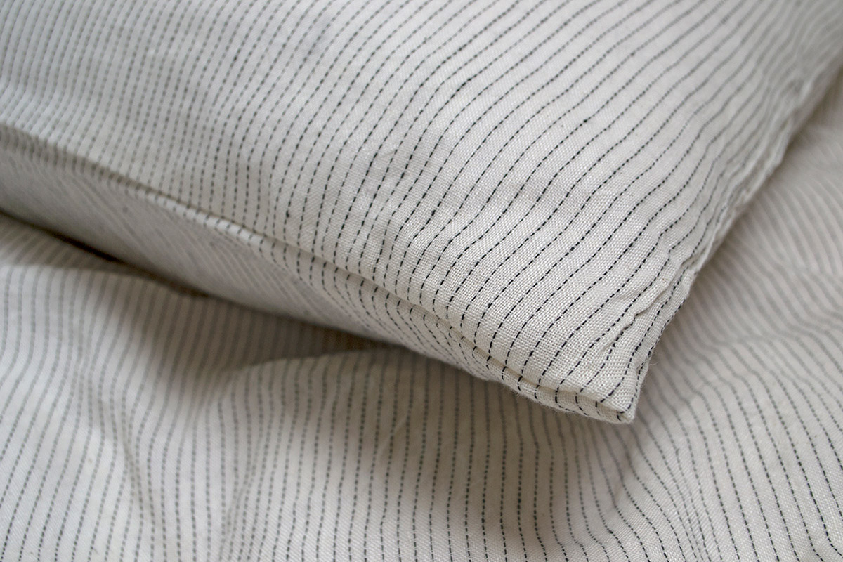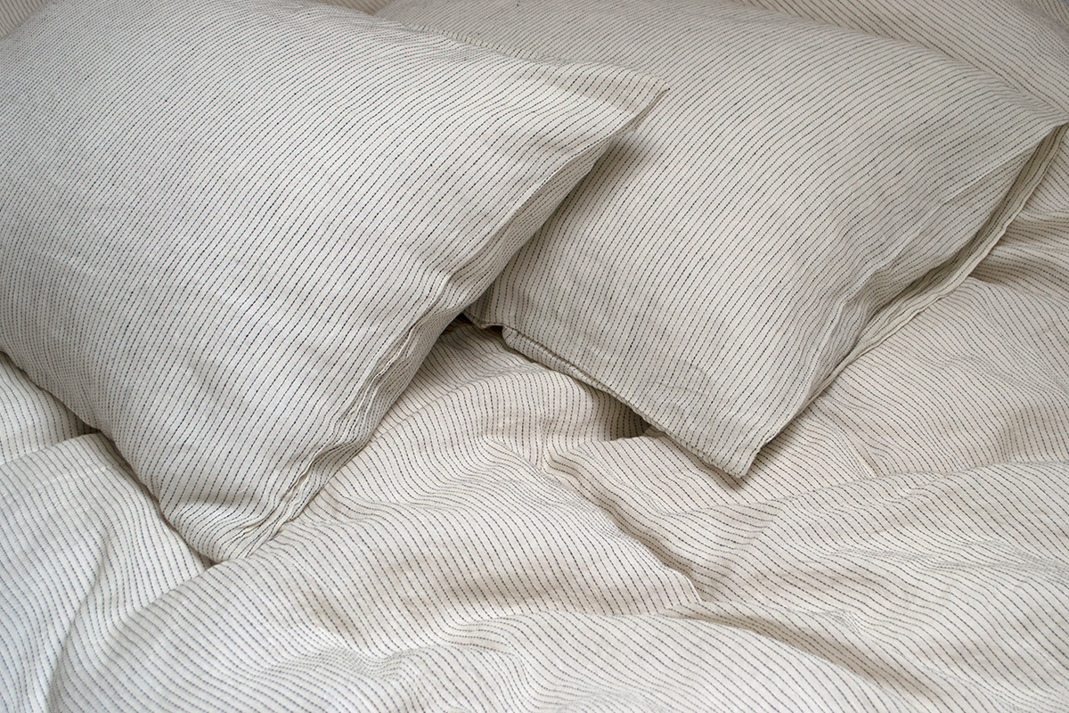 Льняна постільна білизна преміум-класу. Комплект молочного кольору з тонкими чорними смужками, виглядає стильно та актуально в сучасному інтер'єрі. Натуральна тканина з волокон льону та бавовни м'яка, приємна на дотик, чудово пропускає повітря, забезпечує максимально комфортний та приємний сон.