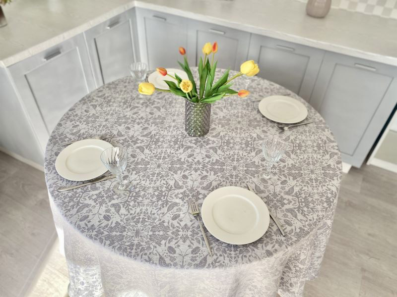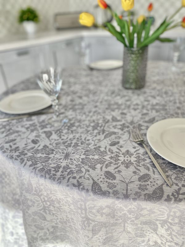 Кругла скатертина з натуральної лляної тканини. Лляна скатертина є прекрасним вибором для тих, хто цінує красу, комфорт і екологічність у своєму домі. Скатертина спокійних сірих відтінків. Гарний візерунок з квітковими мотивами і птахами має дуже ніжний і вишуканий вигляд, створить в інтер'єрі атмосферу затишку і гармонії. Скатертина з 100% льону має безліч переваг, таких як висока міцність і довговічність, зносостійкість, практичність.