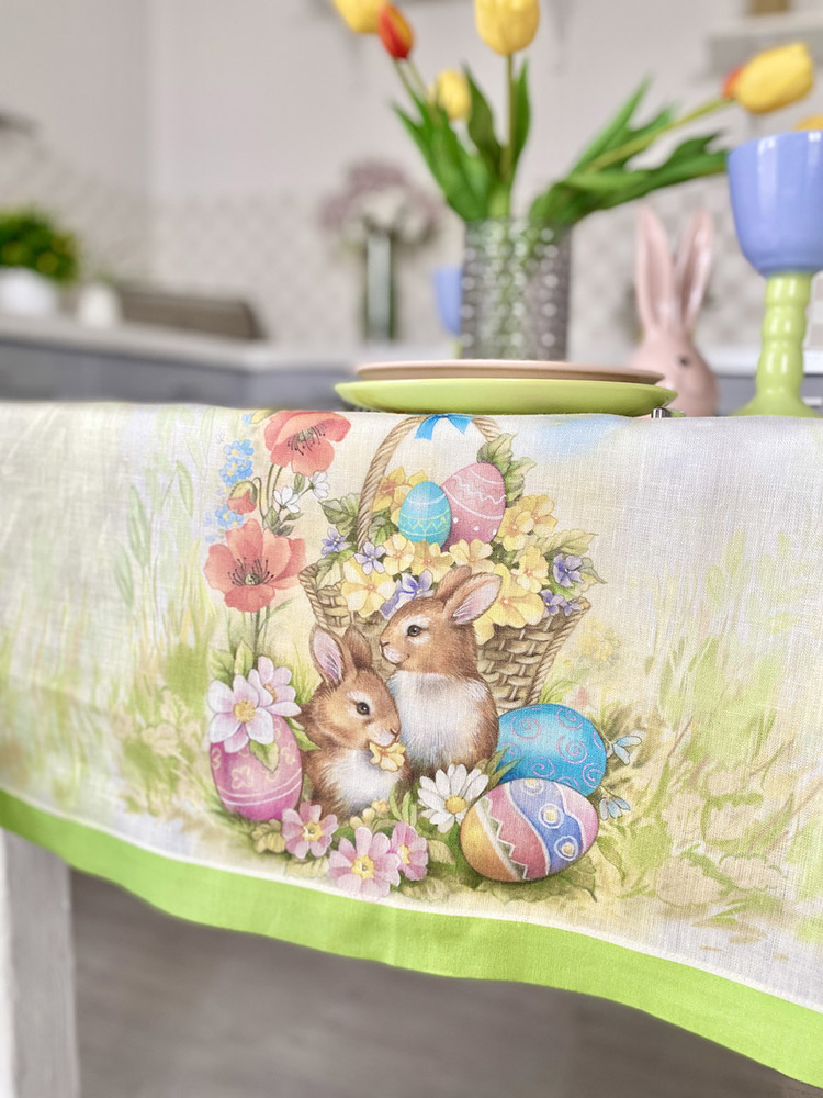 Лляна скатертина в зеленій кольоровій гамі з красивим великоднім малюнком. Скатертина створить особливу атмосферу весни і свята в будь-якому інтер'єрі, прикрасить святковий стіл. Скатертина міцна і довговічна, виготовлена з натуральної лляної тканини високої якості, прослужить вам тривалий час, зберігши привабливий зовнішній вигляд і первинний колір. Великодні мотиви на малюнку (великодній кошик, кролики, писанки і квіти) втілюють у собі символіку свята, дарують відчуття затишку і гармонії. Зелений кант, що обрамляє всю скатертину, надає завершеності композиції, робить скатертину святковою та елегантною. Ця лляна скатертина - ідеальний вибір для тих, хто цінує красу та традиції.