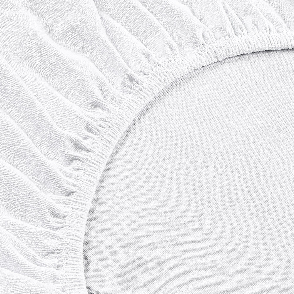 Однотонне махрове простирадло білого кольору. Зручне і практичне рішення для щоденного використання. Простирадло виконано з приємного на дотик матеріалу. М'яка махрова текстура забезпечує комфортний сон у будь-яку пору року, добре пропускає повітря. Завдяки еластичній гумці по периметру, простирадло надійно фіксується на матраці та не сповзає під час експлуатації.