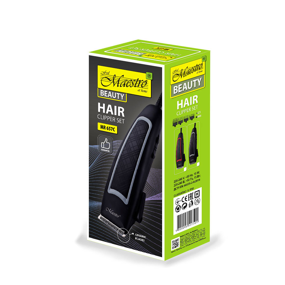 У комплекті з машинкою постачається все необхідне для зручності використання. Чотири змінні насадки (3, 6, 9, 12 мм) дозволяють вибирати потрібну довжину стрижки. Мастило для змащування ножів забезпечує додатковий захист і продовжує термін служби лез. Щітка для чищення машинки дозволяє легко та швидко усувати залишки волосся, підтримуючи прилад у чистоті.